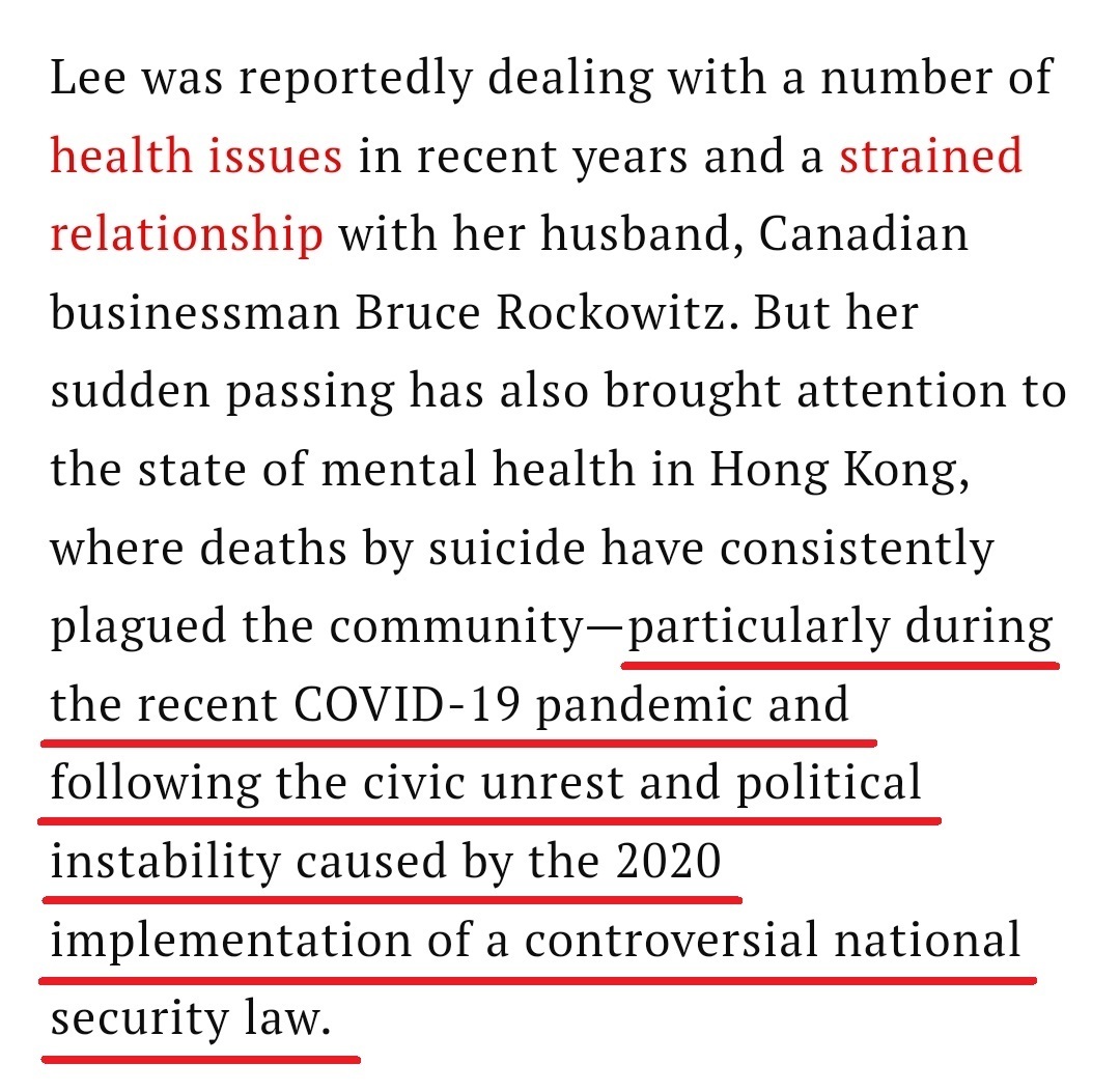 #外媒报道李玟去世形容巨星陨落# 既然有这个话题了,那么我们就来看看美国《时代》周刊在报道此事时如何夹带私货的吧:李玟的突然去世引发了公众对于香港人心理健康的关注——自杀死亡困扰着香港社区,尤其是在新冠大流行期间,以及在2020年实施香港国安法之后。