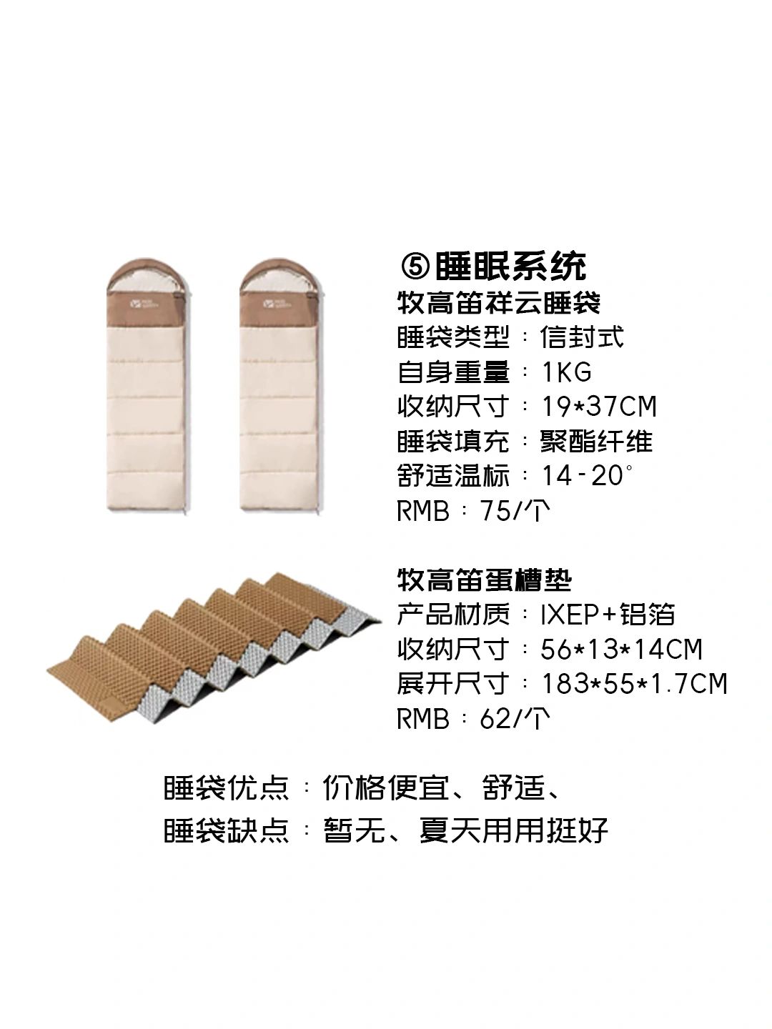 5,睡眠系统①牧高笛祥云睡袋、②牧高笛蛋槽垫在春夏露营有这两个就够了,至于枕头可以用外套折叠一下也很舒服