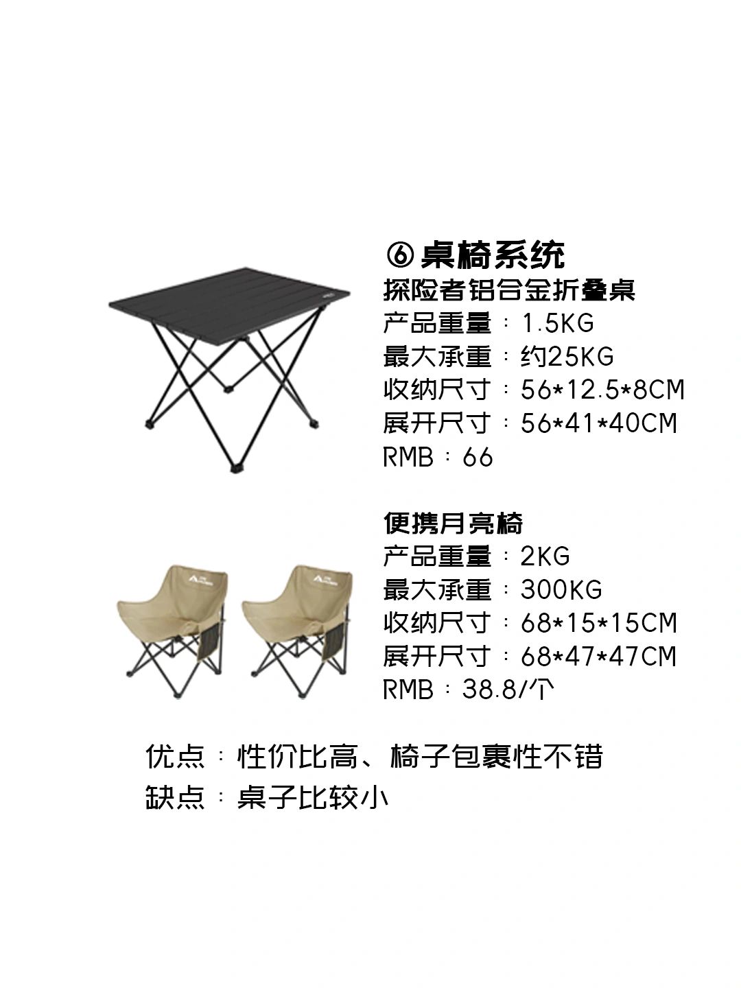 6,桌椅系统①原始人折叠桌、②便携月亮椅原始人这款折叠桌蛮好用的,搭建简单,也很轻,椅子也可以买更便宜的写生椅但是坐久了很不舒服