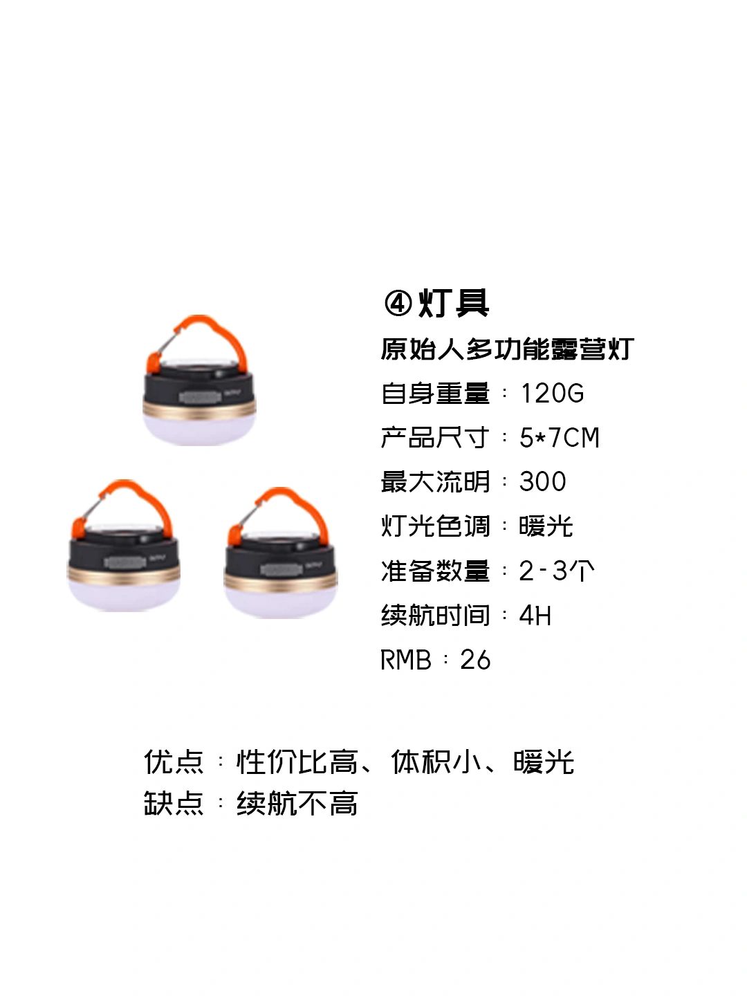 4,灯具原始人露营灯性价比很高、可以备个两个到三个,需要注意的是续航只有4小时左右