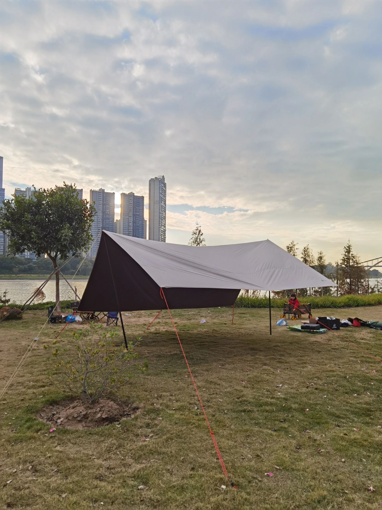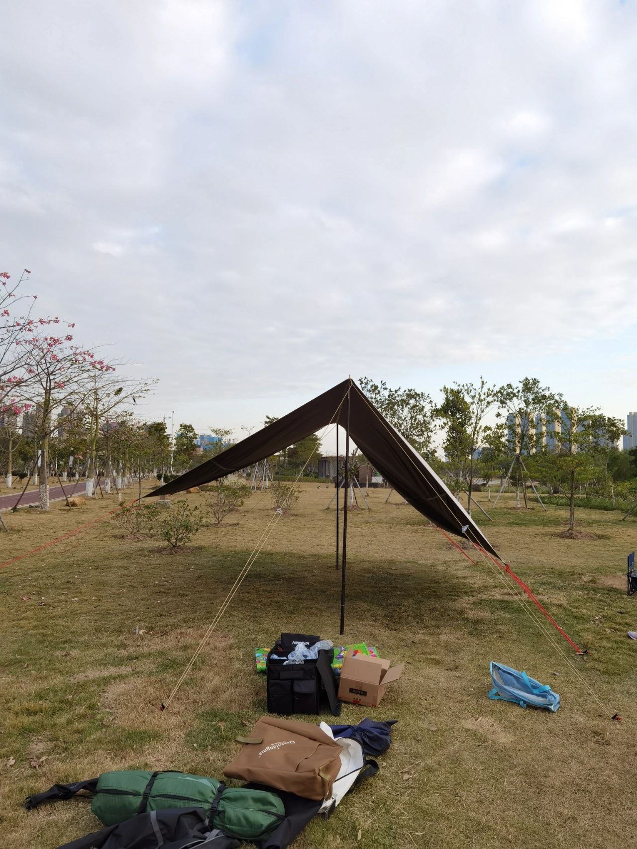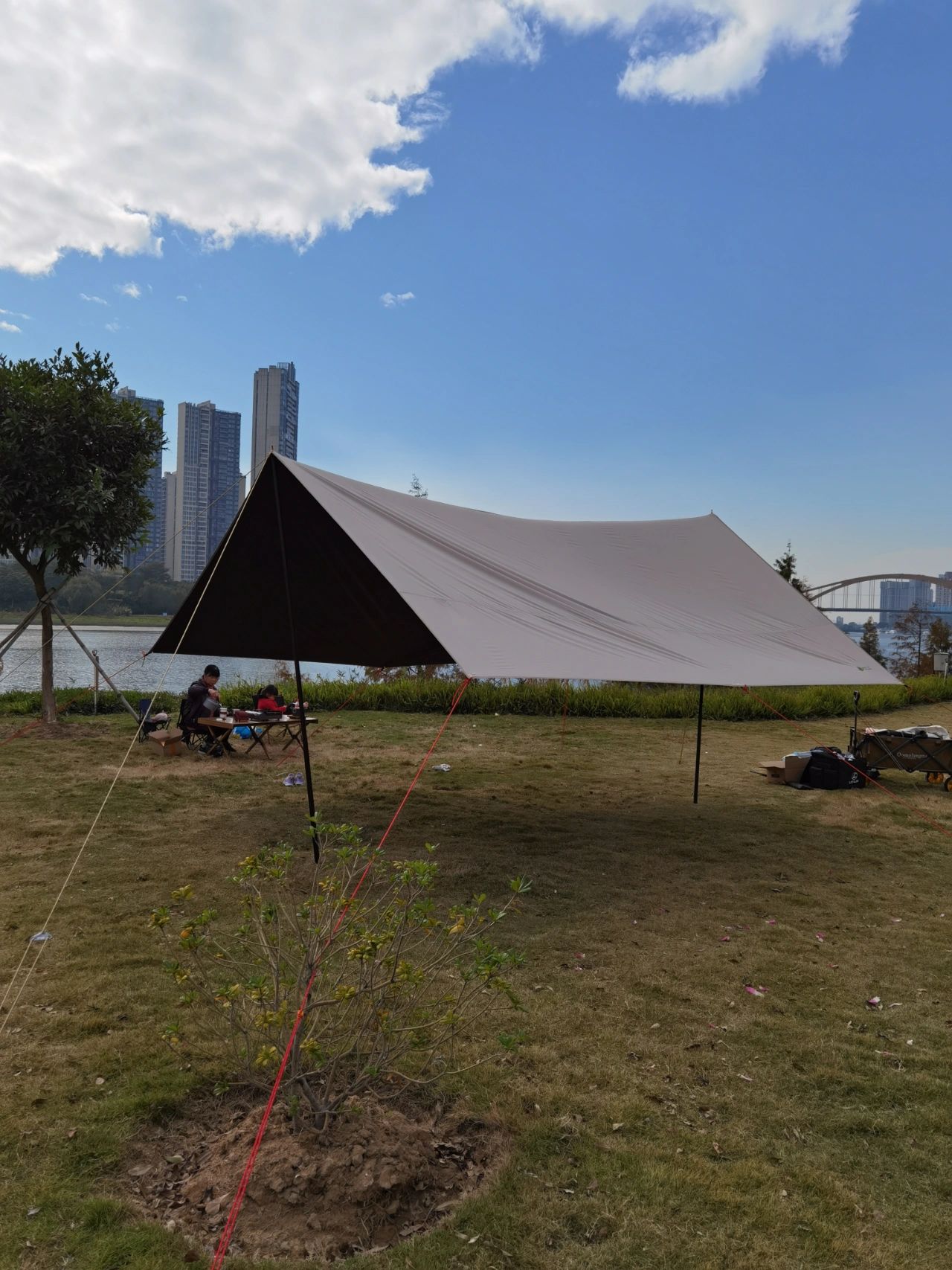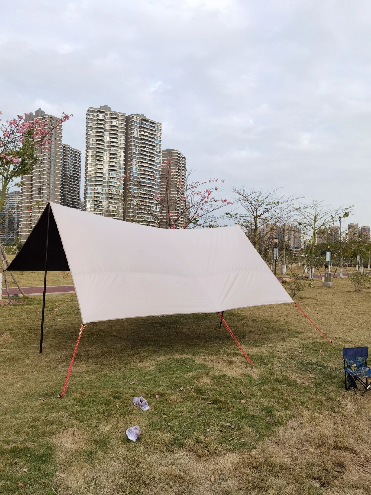 vidalido那款大号双翼的怪兽天幕其实挺不错的,但最后我还是选择了沃野4.4m方型的黑胶卡其色幕布。1、性价比高2、方型的玩法特别多3、遮阳实用率最高图1~3:经典A字型搭法,杆高2.6M,人走进去不会压抑,目测并排对着坐保守可以达12人图4~6:把杆子调到了2.4M,西边的幕布往下收更贴地,解决西晒问题,东边的幕东往上扩大遮阳面图7:赠送的风绳与购买风绳的比较,左边绿色是天幕送的图8:赠送的地钉与购买地钉的比较图9:山趣可调节的铝合金杆子,共4节,你想要的高度都可以自由想像。这杆子看上去挺有档次的,所以我已经再买多了两根,共四根杆子可以撑出的造型更多。