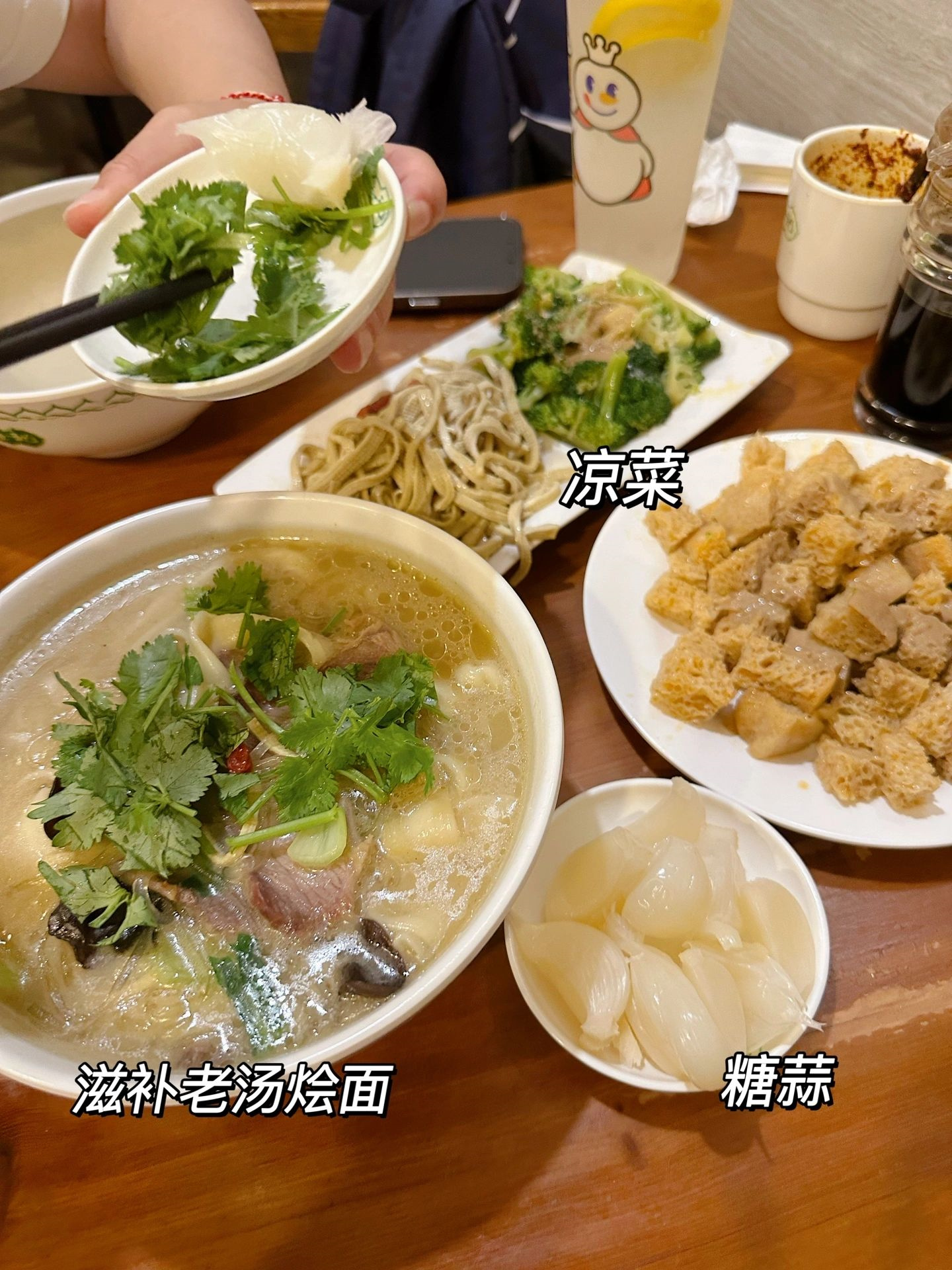 1、合记烩面:点餐很混乱,感觉挤在点单台吼,但味道还不错,配糖蒜和拌菜。