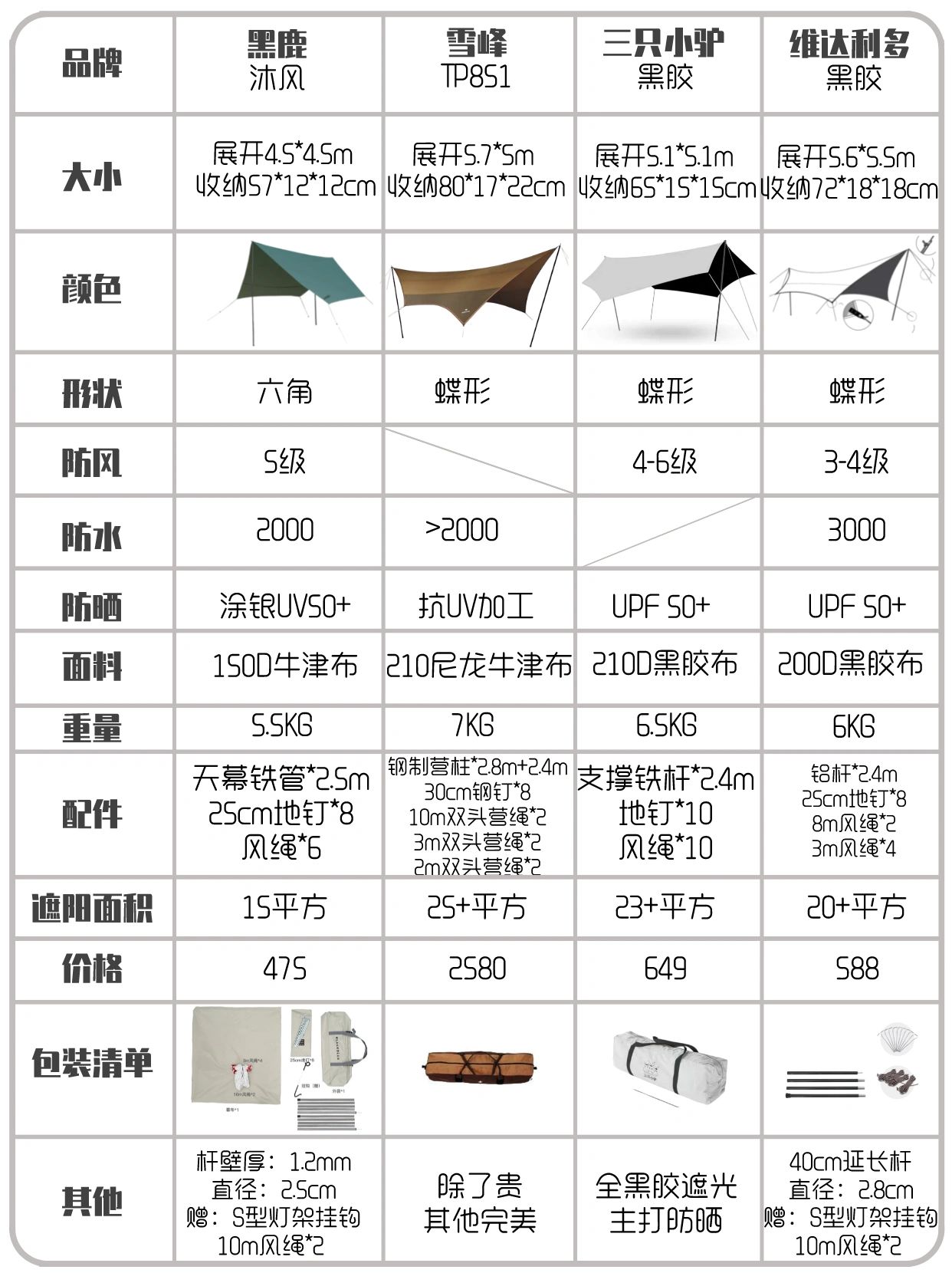 天幕重量tips:重量这个目前不需要太考虑,基本上天幕越大就越重但是整体还是比较轻的,相对于帐篷来说,主要考虑体积即可,不过目前收纳体积都大。