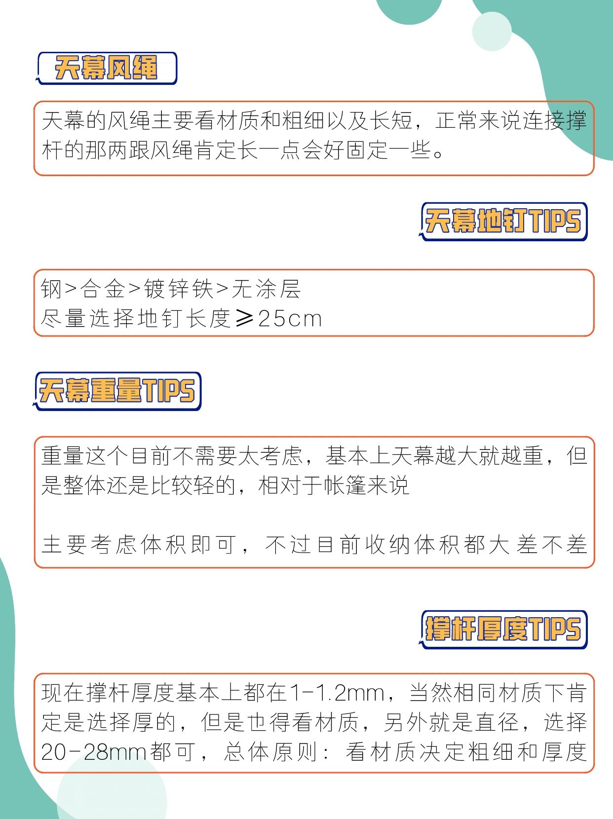 天幕撑杆tips:撑杆2.1米的适合小天幕,如果没有涂层,夏天会很闷热,尽量选择2.4米及以上的撑杆不会弯腰和低头。天幕的风绳主要看材质和粗细以及长短,正常来说连接撑杆的那两跟风绳肯定长一点会好固定一些。
