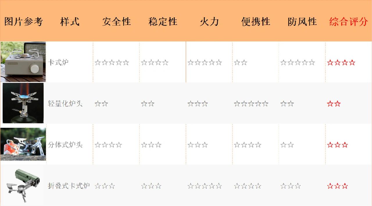 选用气罐炉具最重要就是安全,安全,安全,这里不做品牌的推荐,预算可以根据个人需求来进行筛选。由于篇幅有限,以下节省了很多内容,具体可以看图。好了,正式开始,这里从几个主要的纬度去做分享,如下