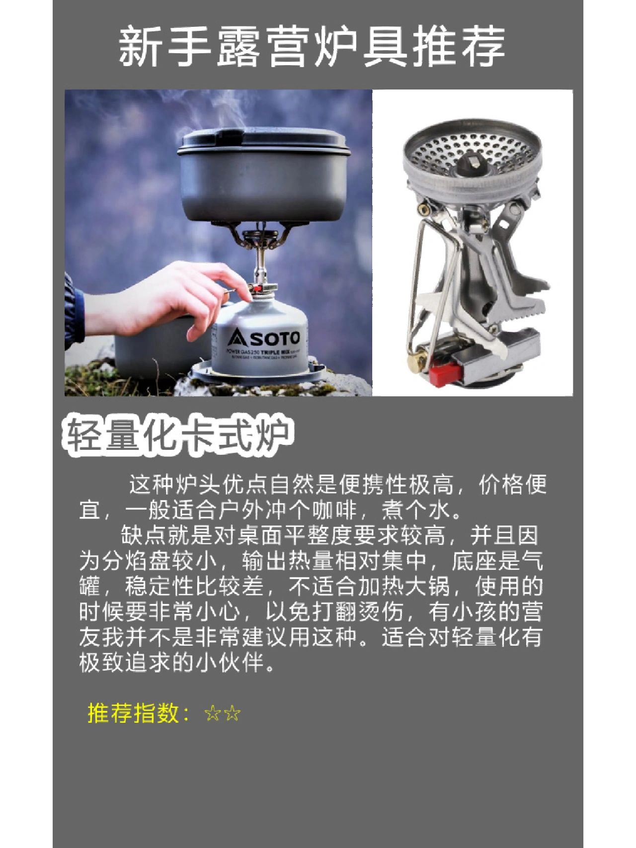 大致将他们分为:卡式炉优点是火力猛,放置东西也比较稳定,内置打火器,点火也不用到处找火机了。缺点嘛,硬要说那就是体积了,再说谁露营还没个车拉装备呢?