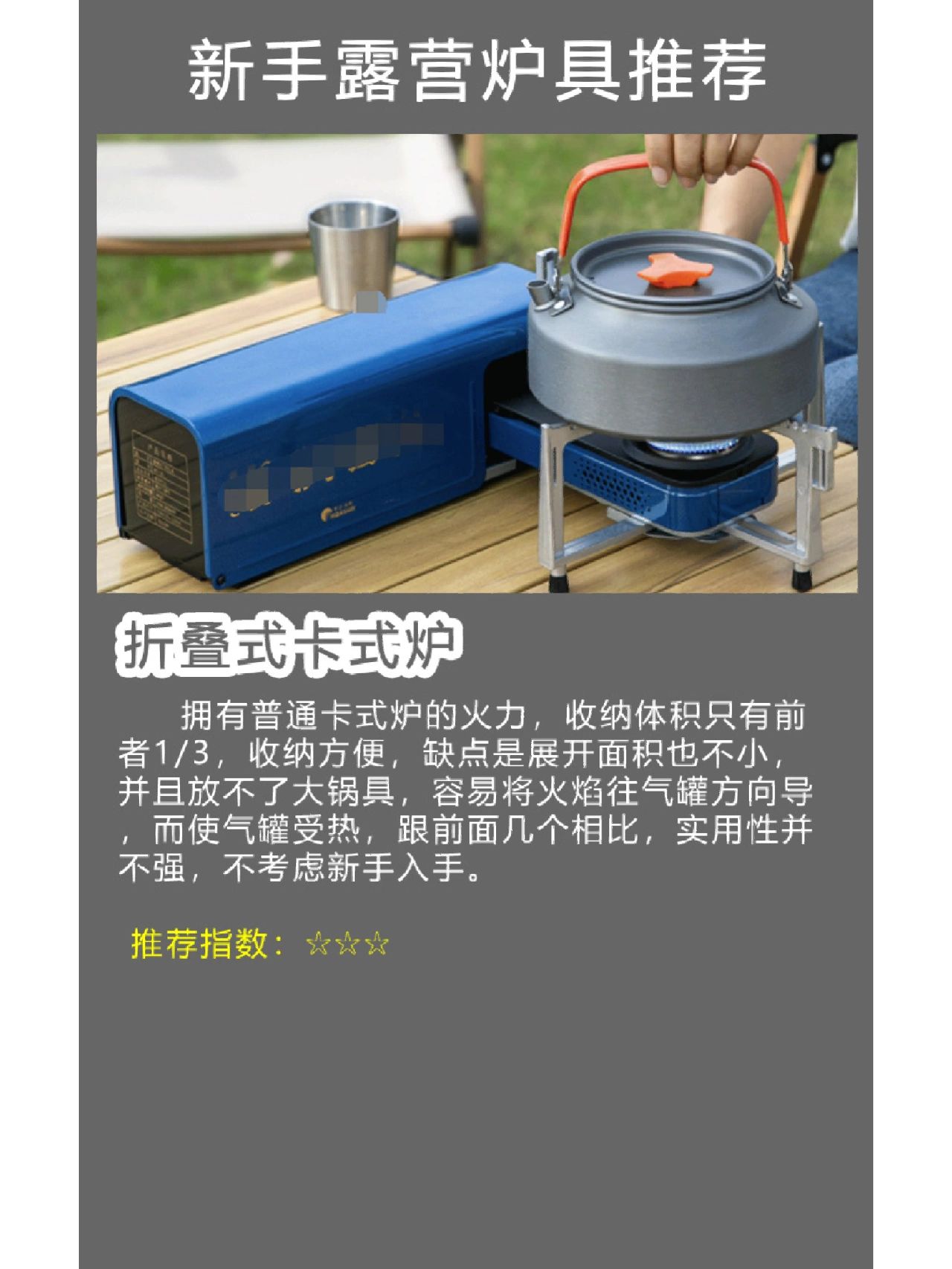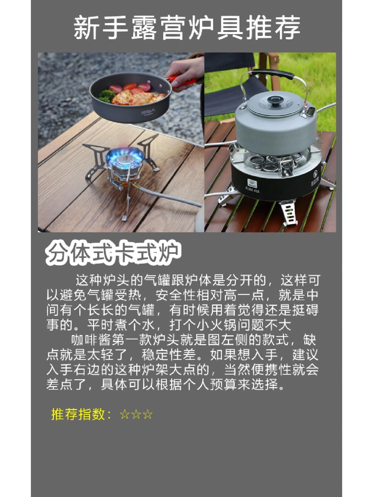 分体式炉头炉头的气罐跟炉体是分开的,安全性相对高一点,平时煮个水,打个小火锅问题不大。[四R]折叠式卡式炉拥有普通卡式炉的火力,收纳体积只有前者,收纳方便;缺点是用不了大锅具,容易将火焰往气罐方向导,而产生爆炸,跟前面几个相比,实用性并不强,不考虑新手入手。