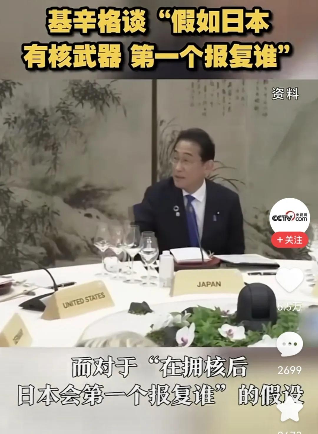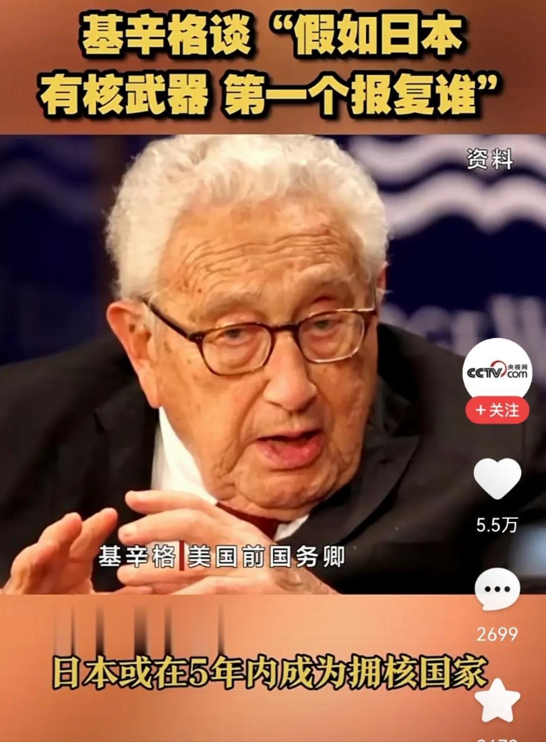 基辛格称日本或在5年内成为拥有核武器的国家。他表示日本一直积极推动自己成为有核国家,而一旦日本拥有了核武器,不排除日本会对美国进行报复。