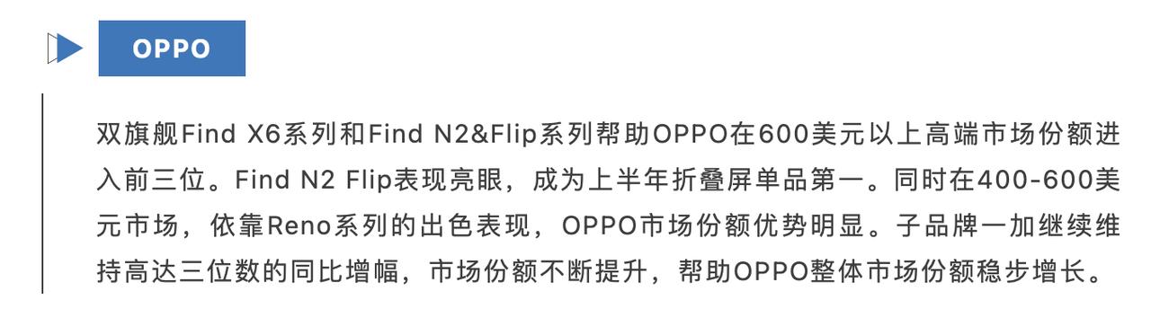 三星、华为都得往后靠靠?这款小折叠屏手机有点东西的啊!最近看到有调研机构发布了2023年1-5月份国内折叠屏手机的销量报告,其中OPPO Find N2 Flip的份额占比达到了14.8%,差不多是第二名的两倍,比三星、华为的小折叠屏销量高很多。 而且除了在折叠屏领域大放异彩以外,OPPO手机整体的销量表现也很不错。据数据来看,2023年二季度OPPO再次蝉联了国内手机销冠,也就是说,2023整个上半年时间中,OPPO的销量都是第一,确实是有点东西的。而且现在OPPO K11新机刚发布,下半年还会有多款新机面世,感觉年度销冠稳了。