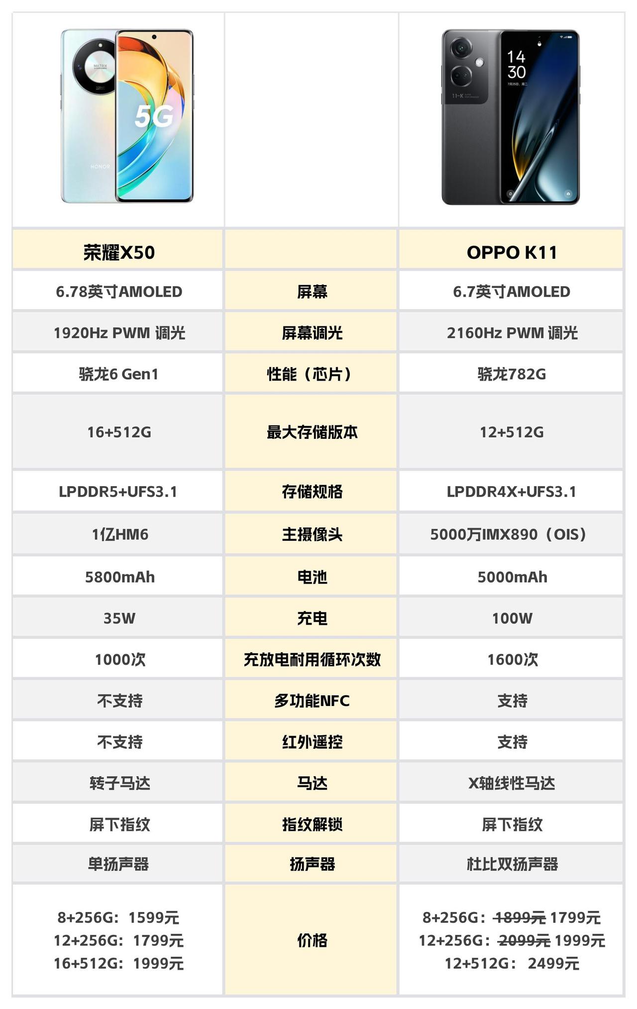千元机可以喷他们的塑料边框,可以说影像不如影像旗舰,唯独这俩我相信是短板最少,配置“高人一等”十分抗造的机型!十面抗摔的荣耀X50和IMX890影像卷王OPPO K11,价格相近选谁都很合理。 荣耀X50优:①设计好,曲面屏高端旗舰机标配,背壳是素皮看着高级。②续航持久,5800mAh+骁龙6,低功耗算是整明白了。缺:①骁龙6打大游戏吃力。②单扬+转子马达。 OPPO K11优:①设计有辨识度,非奥利奥的设计胜在不割手,握持手感10分。②性能更好,骁龙782G能够畅玩主流手游。③5000mAh电池配100W双电芯闪充,同价位可以说很罕见。④IMX890主摄带光学防抖,某4K档旗舰主摄还没有OIS我就不说了~缺:不支持无线充,预算内的顾客可以无视,如果你想找来做备用机,那确实需要适应。 不吹不黑,暑期最火就这两台千元机,荣耀胜在续航OPPO胜在全能,如果是你你会更喜欢哪台呢?
