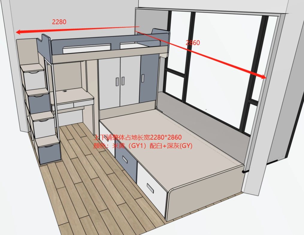 房间再小的情况下,选用床整体高度是1500,上下不压抑,下铺1160*2035的尺寸,上铺选用1010*1910尺寸,两个孩子睡着也足够了,在这基础上在床上搭配上衣柜书桌,更合适了。