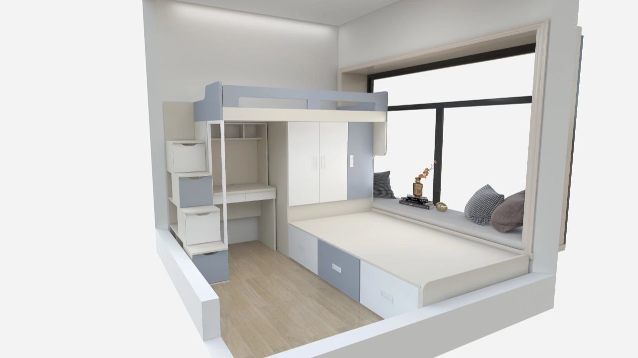 两个小孩住小房间,设计上下床再合适不过了,在一定程度上省了空间,再搭配上衣柜和书桌,把学习区域和储物区域都省了,把这些多余的空间留给孩子当娱乐区。