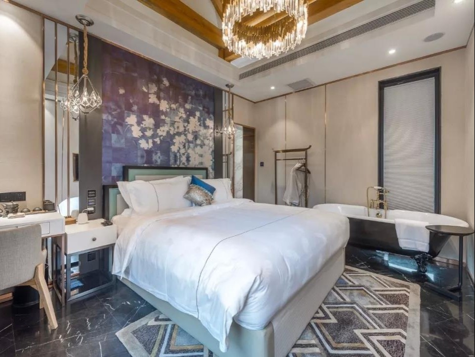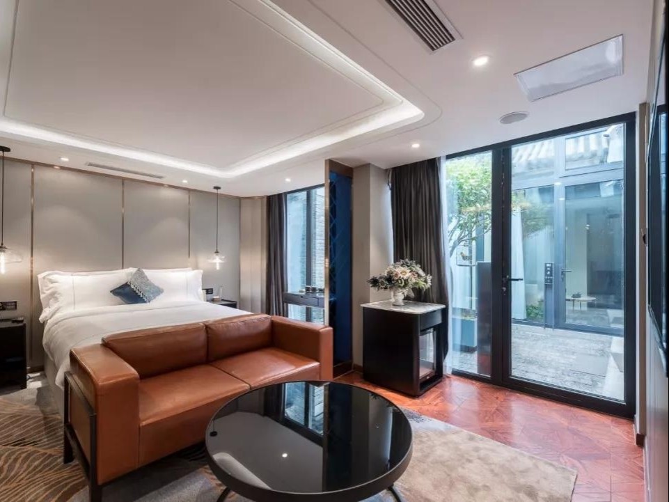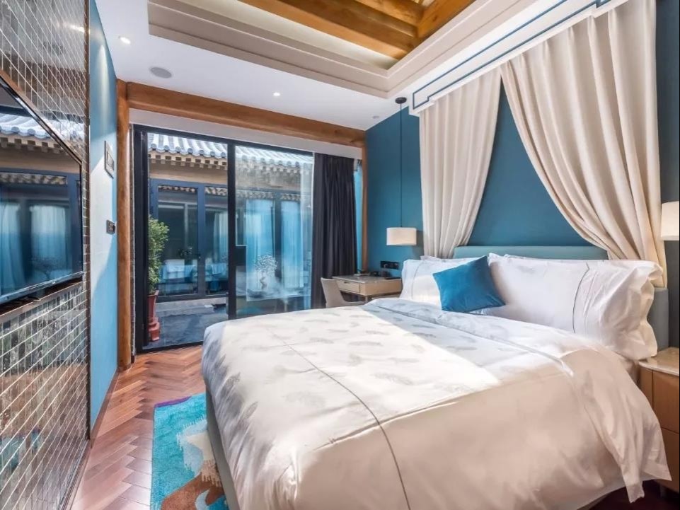民宿分为东西两个院子,共有10间客房。落地窗朝着院中,被青砖包裹着,入眼简洁的白与蓝占据主色,精致又气派。房间里面是装修也是传统又现代,电动窗帘, 蓝牙音响这些黑科技随处可见,欧舒丹的洗漱用品也是超级大牌~民宿的大部分房间都有超大浴缸,装修非常讲究~