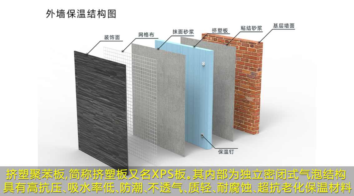 挤塑聚苯板的全称是挤塑聚苯乙烯泡沫板,简称挤塑板,又名XPS板。其内部为独立的密闭式气泡结构,是一种具有高抗压、吸水率低、防潮、不透气、质轻、耐腐蚀、超抗老化(长期使用几乎无老化)、导热系数低等优异性能的环保型保温材料。这种材料也是外墙保温最为常见的一种,价格上要稍微贵点,优质产品的品质稳定可靠。