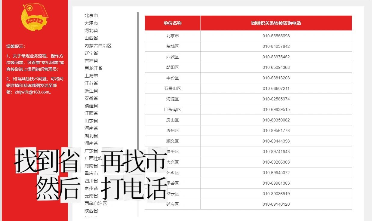 升学后要转移团组织关系 登陆智慧团建的时候 密码忘记了 进入智慧团建页面(电脑版)左下角黄色字体查看详情,找所在省再找所在市的电话(你认为你的团关系在哪个省事、市 就打哪个地方的电话),拨通电话,打电话说话:您好 我是某某地一名团员 我叫... 我现在需要转移团组织 但是智慧团建的密码忘记了 需要找团组织管理员 但是我不知道我的团组织管理员是谁、该找谁,说完这段话 他就直接问我的身份证号和我的姓名,之后就告诉了我验证码! 更改密码后一定要记好哦