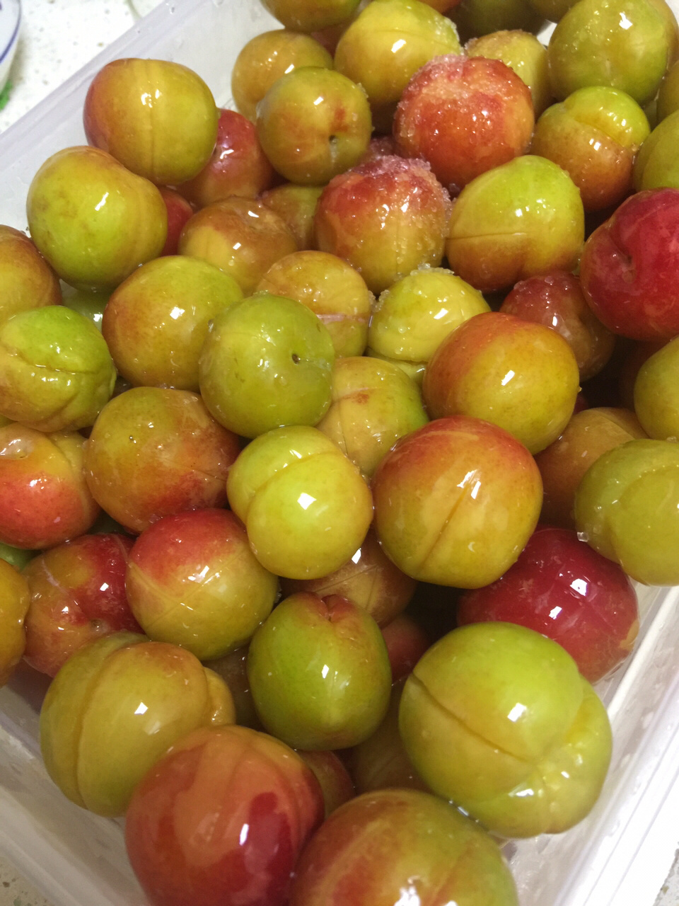 腌李子 材料:李子十斤、盐50克、白糖两斤、凉白开适量 做法:李子洗净,再李子上划几刀(想几刀你随意);2.划好的李子放入盐拌匀腌两个小时左右,然后倒掉里面的涩水,再用凉白开稍微洗掉咸水;3.最后倒入白糖和一小碗凉白开,放冰箱(喜欢辣的人儿这步可以加辣椒粉或小尖椒),随取随吃(切记不要再沾到生水,不然放不了太久)我喜欢腌个把星期的李子,干干脆脆的。 简单又好吃