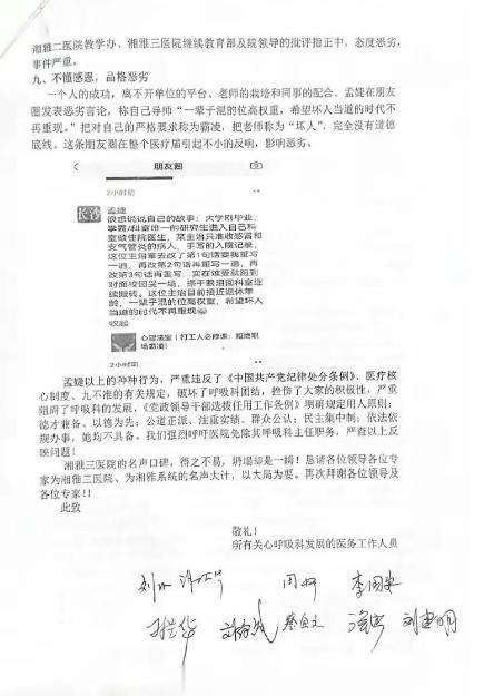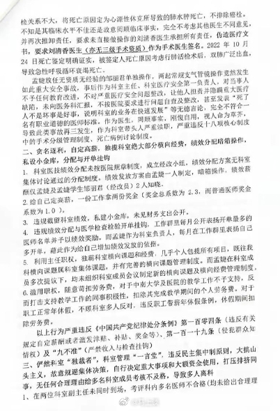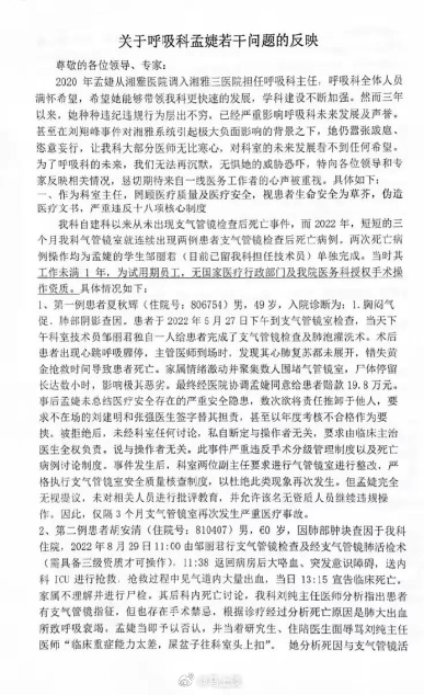 起猛了!湖南长沙中南大学#湘雅三医院9名医务人员联名举报科主任#孟婕: “放任”其无手术操作资质的学生邹某单独进行支气管镜检查,导致3个月内发生2例患者死亡事件,事发后,孟婕伪造医疗文书,要求其他医生签字担责。此外,举报者还反映孟婕“暗箱操作”绩效分配、私设小金库、财务不公开、打压排挤同事等问题。院方回应:正在核实】。