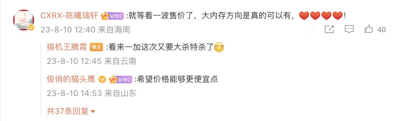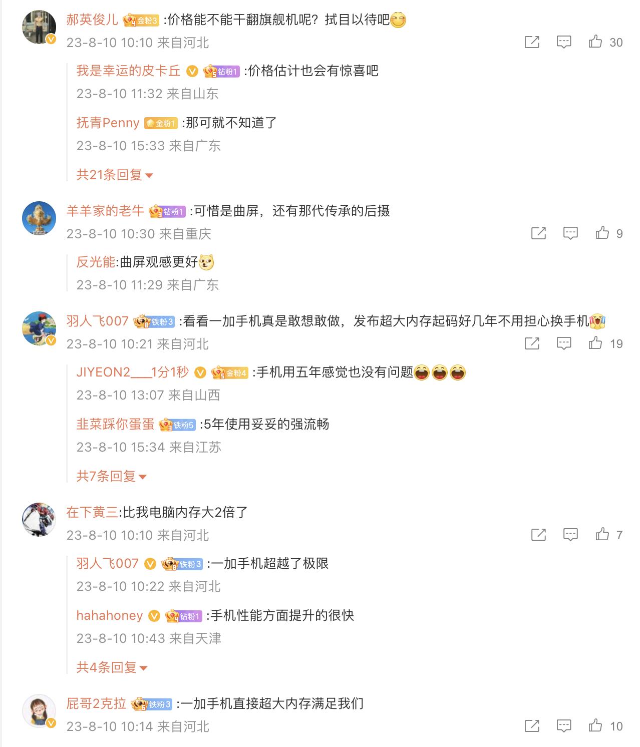 都2023年了,即将发布的iPhone 15居然还是6GB内存?不知道Pro系列会不会上8GB呢?毕竟6GB虽然日常是够用了,但如果后台经常驻留多个APP的话,还是会有掉后台的概率。相对来说,安卓这边有诚意多了,比如即将发布的一加Ace2 Pro,就直接给到了24GB超大内存,没有对比就没有伤害啊! 看了一下评论区,感觉多数网友还是挺期待的,甚至还有网友表示一加Ace2 Pro的内存比他电脑还要大2倍。而且除了24GB大内存以外,一加Ace2 Pro还有150W闪充、1.5K京东Q9+屏幕和骁龙8 Gen2处理器等配置,大家猜一下定价多少起步?