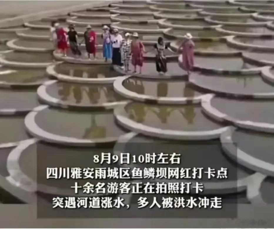 8月9日上午9时许,11位大妈在四川雅安网红河道陇西河鱼鳞坝拍抖音,突遇陇西河上游涨水,大妈们集体落水,被河水冲走。最终4人获救、7人遇难。