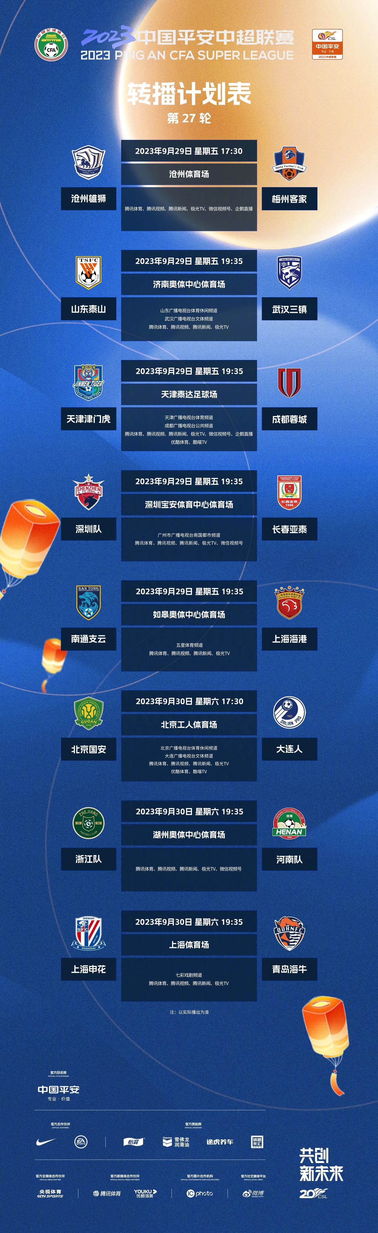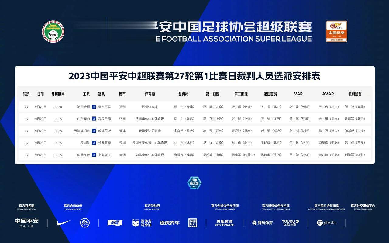 主裁判马宁执法强强对决,中超官方今日公布第27轮裁判安排!转播计划表公布! 9月29日19点35分,主裁判马宁执法山东泰山对阵武汉三镇队的中超比赛,视频裁判黄翼。马宁执法还算公正,中超联赛官方今日公布转播计划,本场比赛由山东体育频道、武汉文体频道、腾讯体育、极光TV直播本场比赛。 金京元执法天津津门虎对阵成都蓉城队比赛,刘钊吹罚深圳队和长春亚泰比赛,唐顺齐担任南通支云与上海海港队的比赛主裁判, #妙笔生花创作挑战# #中国足球# #山东泰山# #中超#