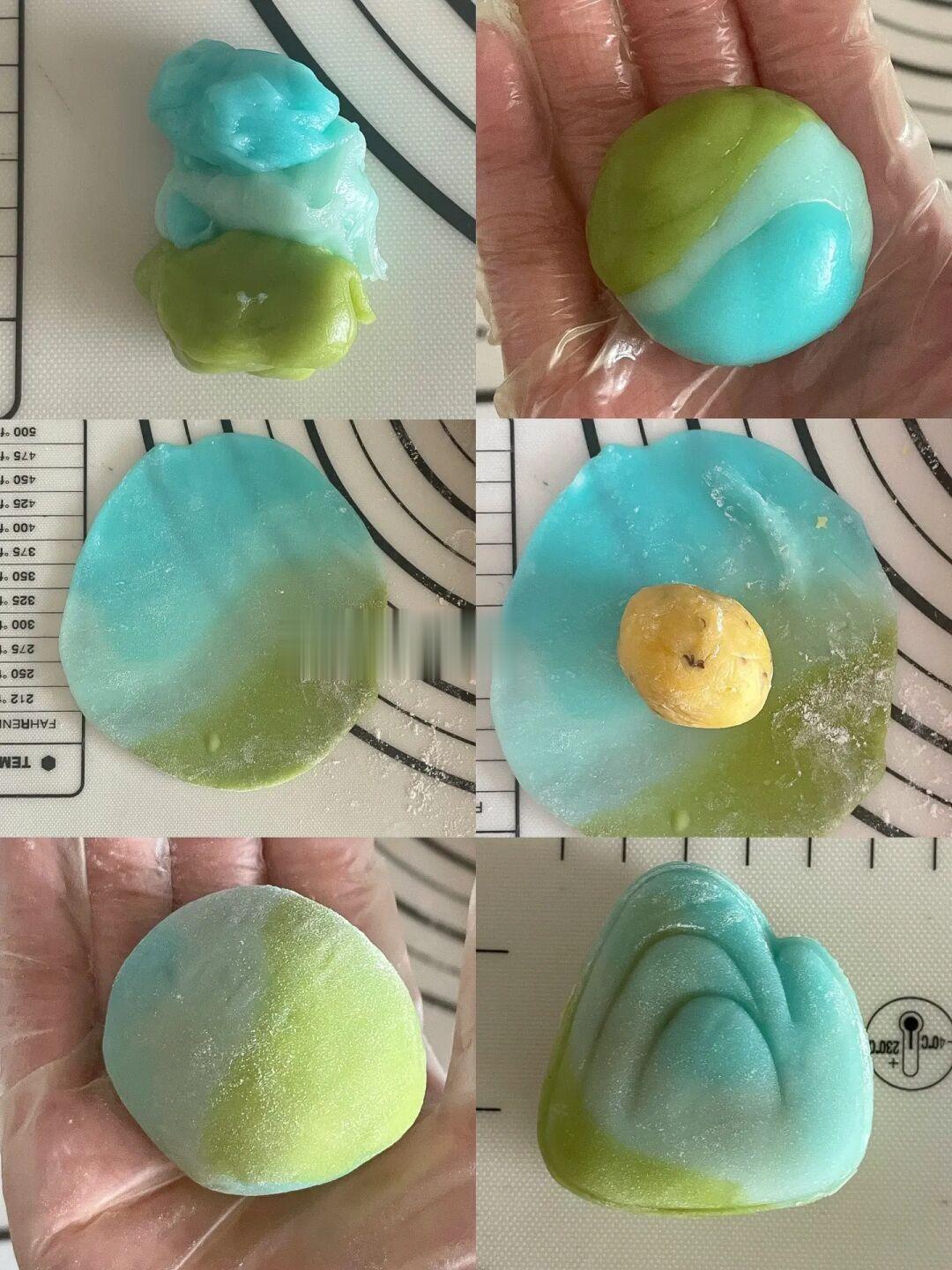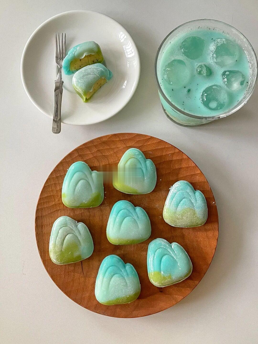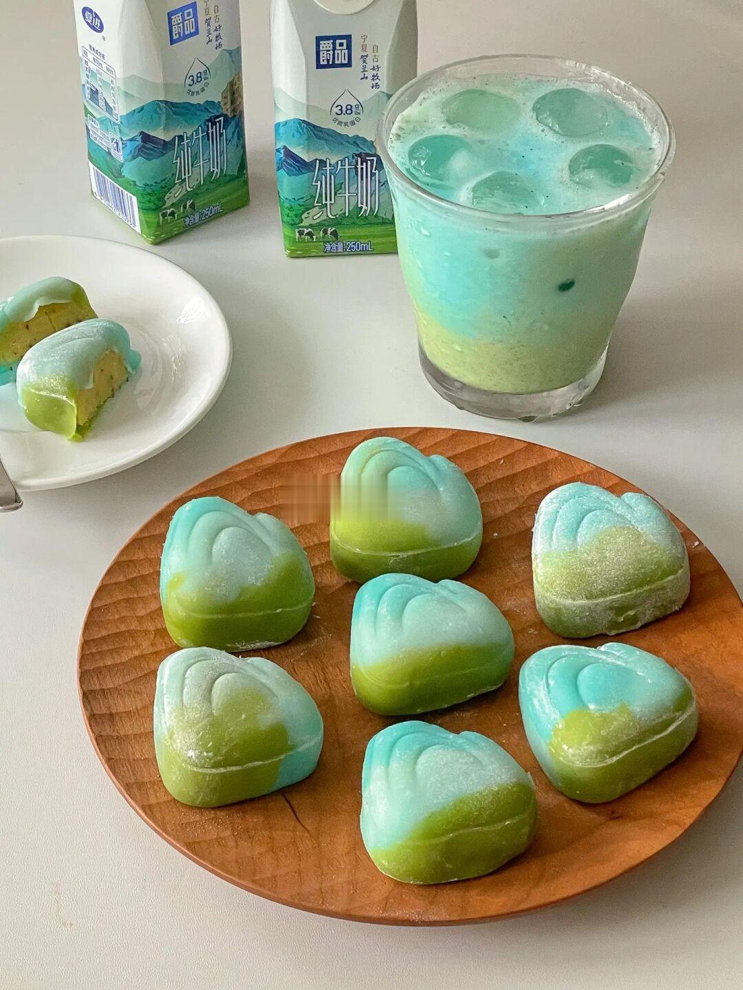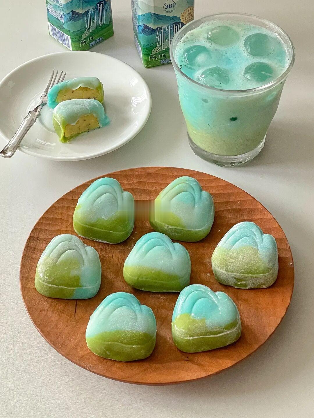 尝试做了⛰️青绿配色的冰皮月饼 有点特别! 糯叽叽冰冰凉凉的冰皮 吃起来不会腻 还有着淡淡的桂花香 - (冰皮月饼50g/个) 材料: 糯米粉20g、粘米粉15g、澄粉 15g、植物油10g 、牛奶90g、糖粉25g 步骤: 1️⃣粉类混合均匀倒入碗中后加入糖粉和牛奶搅拌均匀后倒入植物油在搅拌均匀 2️⃣面糊过筛倒入盘中,盖上保鲜膜,在保鲜膜上戳几个洞后放入开水锅中蒸20分钟左右 3️⃣稍微晾凉后,戴上手套揉至面团光滑 4️⃣面团揉完后盖上保鲜膜,等面团晾凉后再放入冰箱冷藏一小时 5️⃣做好的冰皮平均分为3份,加入蓝色素和抹茶粉,做成绿色、淡蓝、深蓝 6️⃣每个颜色各揪一些,合在一起的饼皮重量为25g - 组合 1️⃣冰皮揉圆,压扁后翻过来盖着馅料,然后再将月饼翻过来用大拇指和食指轻轻的往上收口 2️⃣模具提前粘上熟糯米粉,防止月饼粘在模具上取不下来 3️⃣包好的月饼滚上薄薄一层熟糯米粉,抖去多余的粉 4️⃣将月饼放在桌子上,用模具按压出花纹,压的时候尽量停留时间长点,然后再提起模具 5️⃣冷藏一夜后更好吃哦,冰箱保存可以保存3天左右 - 今天的配色灵感来自夏进贺兰山爵品纯牛奶,千里江山图青绿配色也太惊艳了吧🤩 而且产自贺兰山限定产区 奶香味巨浓郁,没有一点奶腥味,喝起来顺滑又香醇!冰冻一下跟鲜奶的口感差不多了!营养口感和颜值都可以说是收藏级的了,拿来中秋国庆送给长辈也很适合,美美的包装,满满的营养!