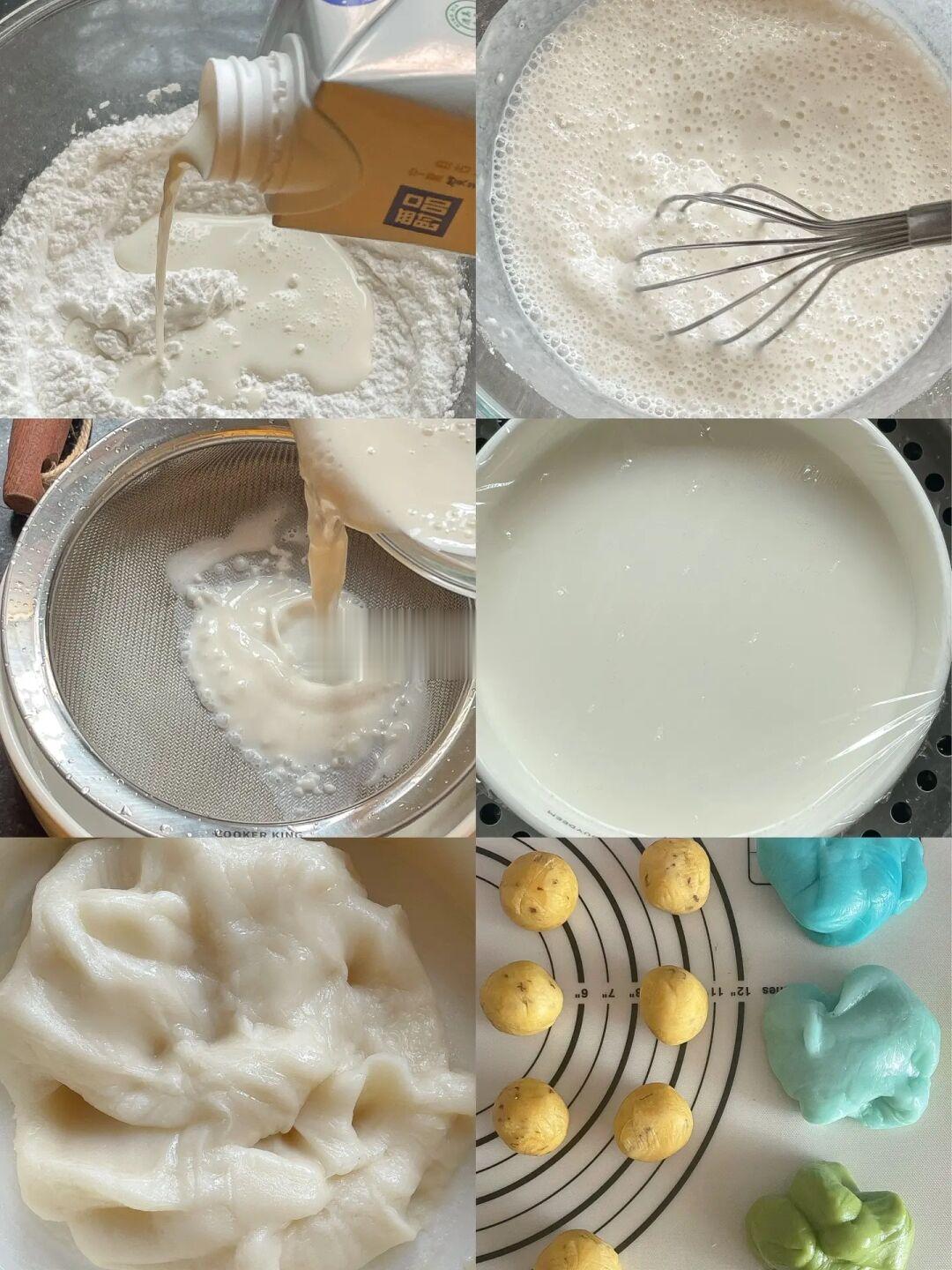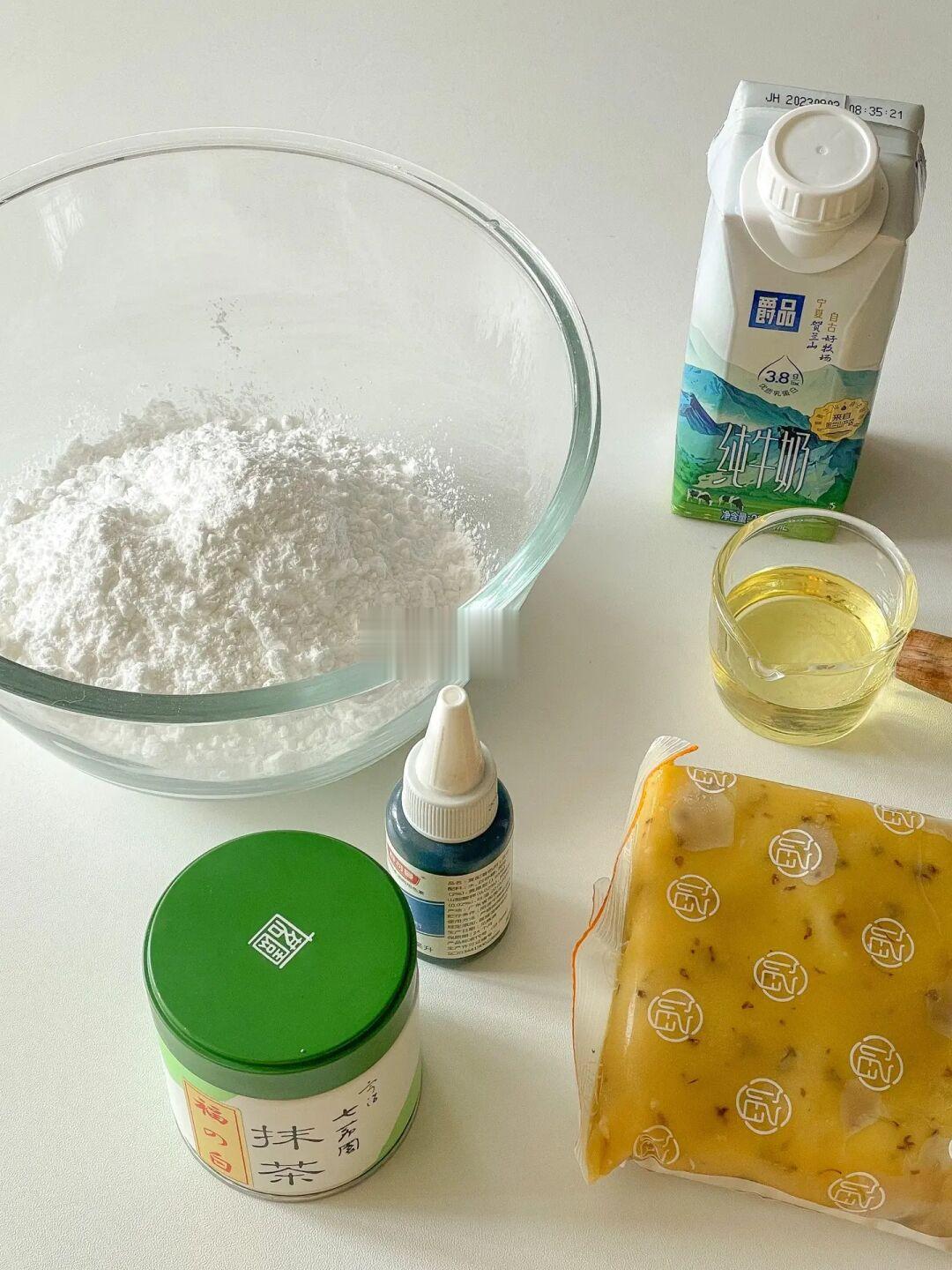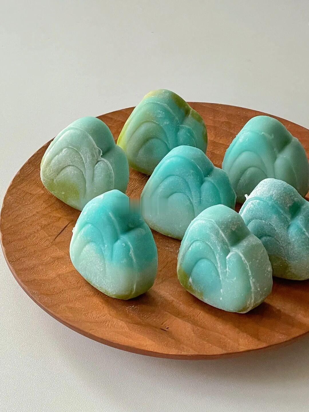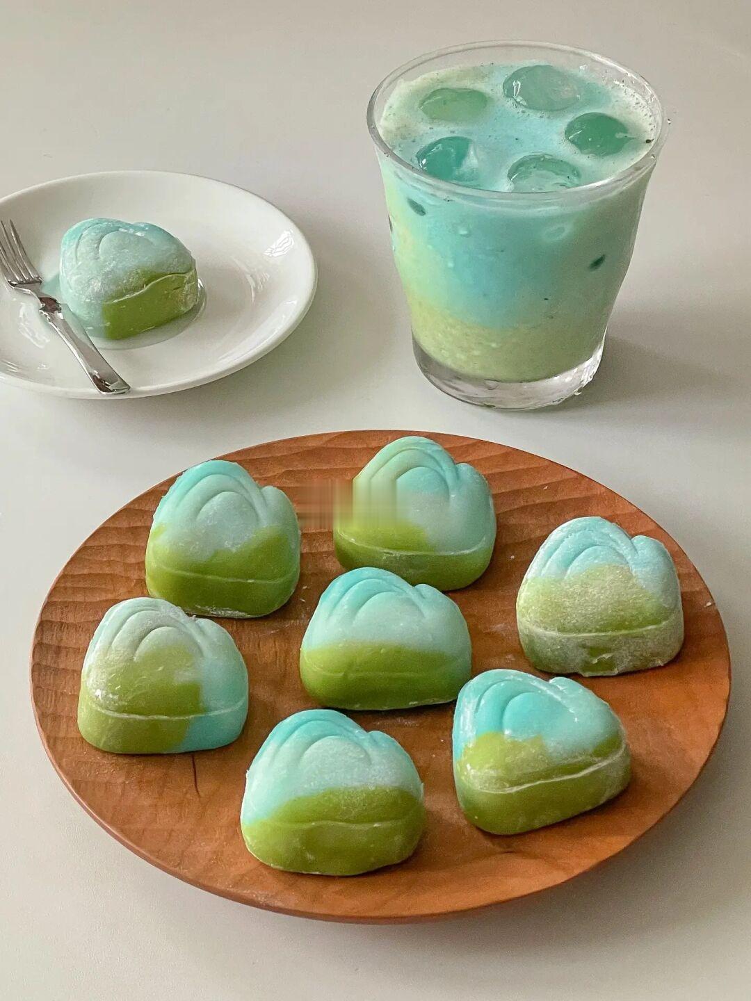 尝试做了⛰️青绿配色的冰皮月饼 有点特别! 糯叽叽冰冰凉凉的冰皮 吃起来不会腻 还有着淡淡的桂花香 - (冰皮月饼50g/个) 材料: 糯米粉20g、粘米粉15g、澄粉 15g、植物油10g 、牛奶90g、糖粉25g 步骤: 1️⃣粉类混合均匀倒入碗中后加入糖粉和牛奶搅拌均匀后倒入植物油在搅拌均匀 2️⃣面糊过筛倒入盘中,盖上保鲜膜,在保鲜膜上戳几个洞后放入开水锅中蒸20分钟左右 3️⃣稍微晾凉后,戴上手套揉至面团光滑 4️⃣面团揉完后盖上保鲜膜,等面团晾凉后再放入冰箱冷藏一小时 5️⃣做好的冰皮平均分为3份,加入蓝色素和抹茶粉,做成绿色、淡蓝、深蓝 6️⃣每个颜色各揪一些,合在一起的饼皮重量为25g - 组合 1️⃣冰皮揉圆,压扁后翻过来盖着馅料,然后再将月饼翻过来用大拇指和食指轻轻的往上收口 2️⃣模具提前粘上熟糯米粉,防止月饼粘在模具上取不下来 3️⃣包好的月饼滚上薄薄一层熟糯米粉,抖去多余的粉 4️⃣将月饼放在桌子上,用模具按压出花纹,压的时候尽量停留时间长点,然后再提起模具 5️⃣冷藏一夜后更好吃哦,冰箱保存可以保存3天左右 - 今天的配色灵感来自夏进贺兰山爵品纯牛奶,千里江山图青绿配色也太惊艳了吧🤩 而且产自贺兰山限定产区 奶香味巨浓郁,没有一点奶腥味,喝起来顺滑又香醇!冰冻一下跟鲜奶的口感差不多了!营养口感和颜值都可以说是收藏级的了,拿来中秋国庆送给长辈也很适合,美美的包装,满满的营养!
