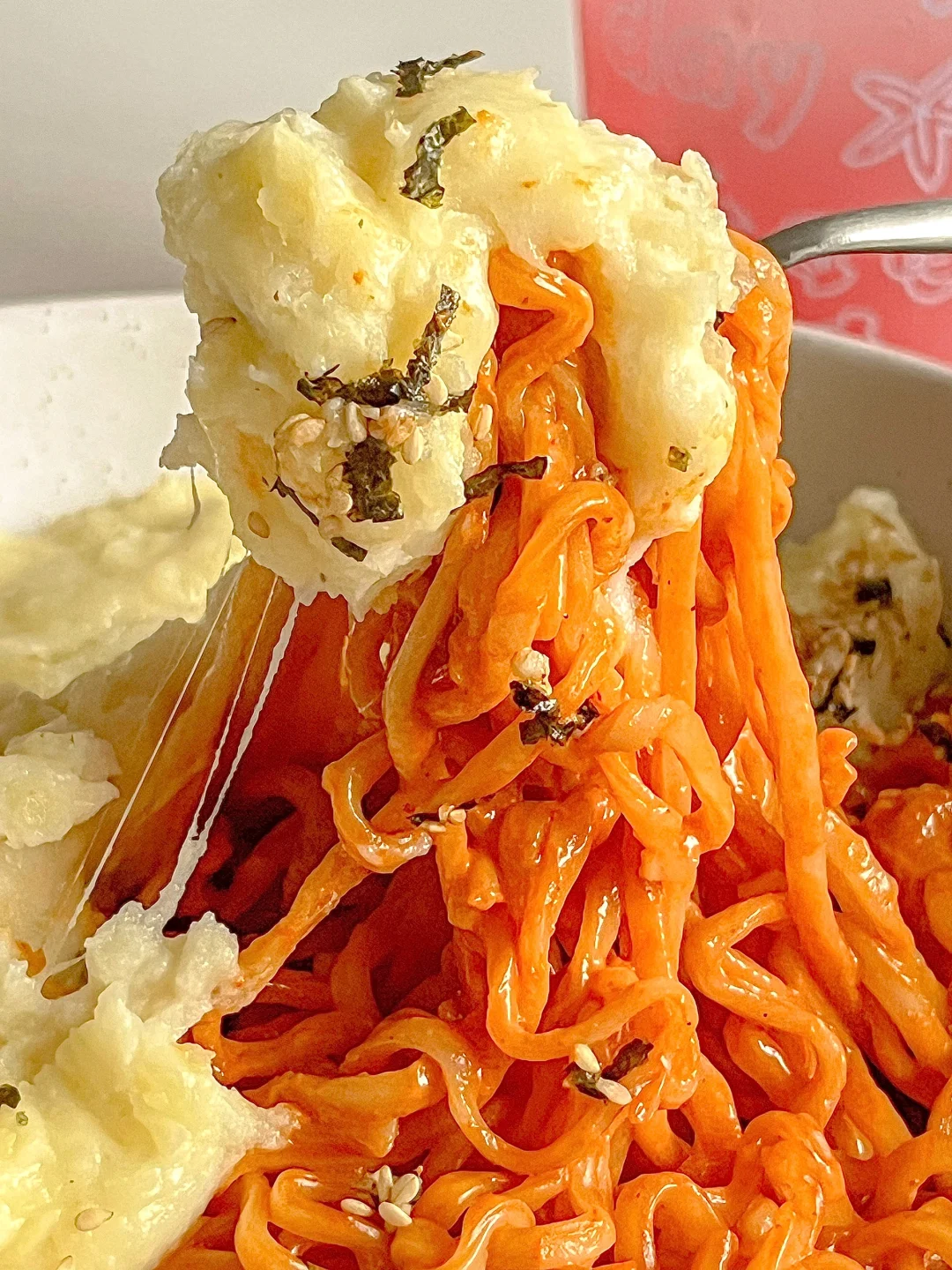 ③:煮好的火鸡面加入芝士瀑布