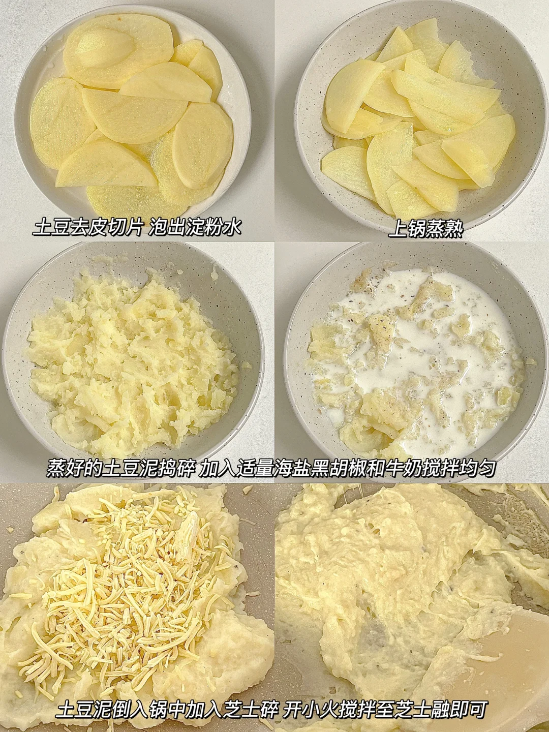 ① :土豆去皮切片,泡出淀粉水后沥干水份,上锅蒸熟。蒸好的土豆捣碎成泥,加入适量海盐黑胡椒和适量牛奶搅拌均匀。倒回不粘锅中,加入适量芝士碎,开小火,不停搅拌至芝士完全融化即可