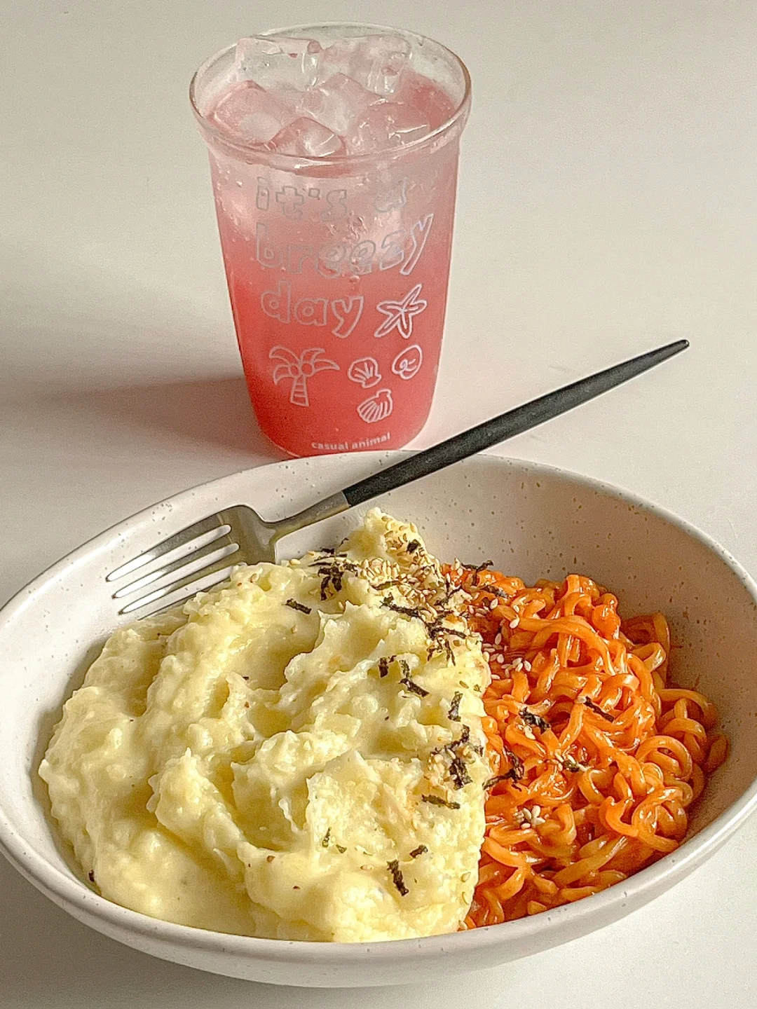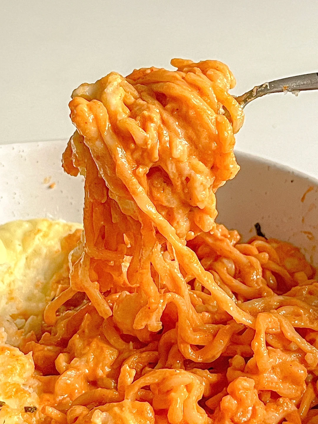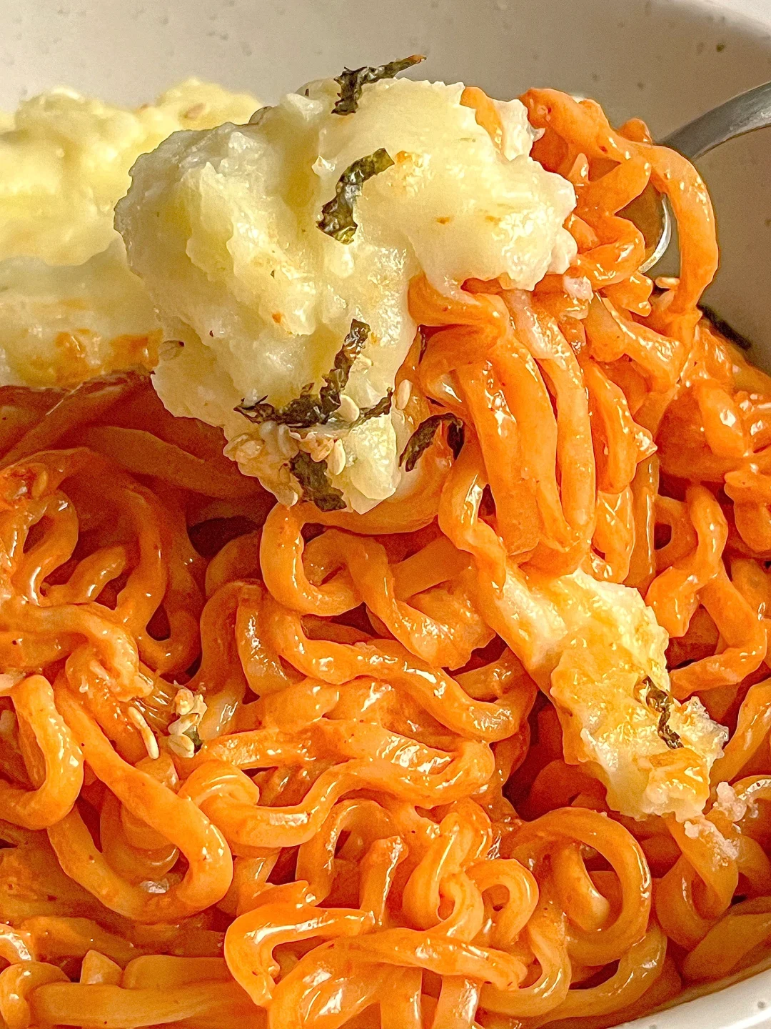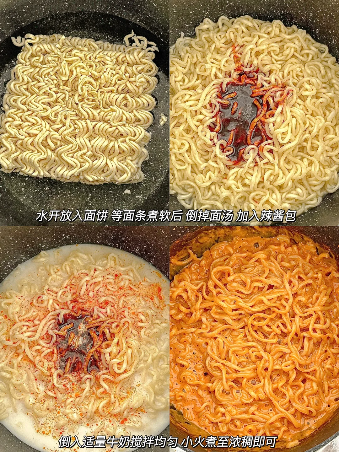 ② :水开放入面饼,面条煮软后倒掉煮面的面汤,加入火鸡面酱包和适量牛奶搅拌均匀,开小火煮至浓稠状即可(火鸡面的神仙煮法,还可以放一片芝士片,奶香浓郁而且不辣,适合不太能吃辣的宝子)
