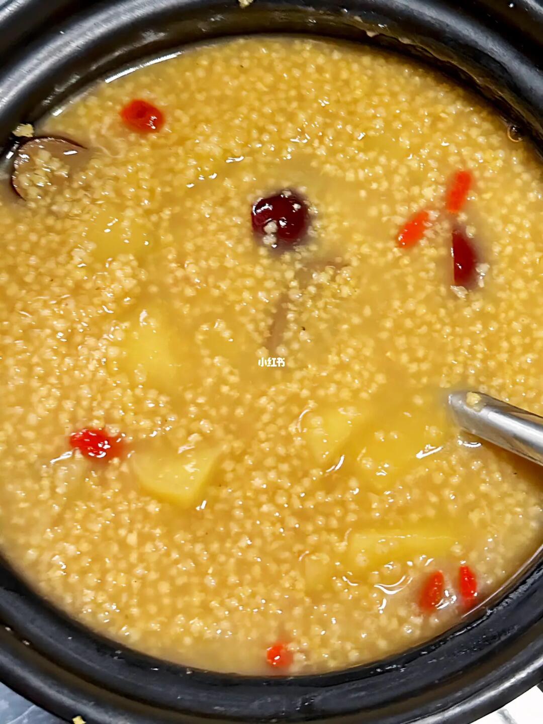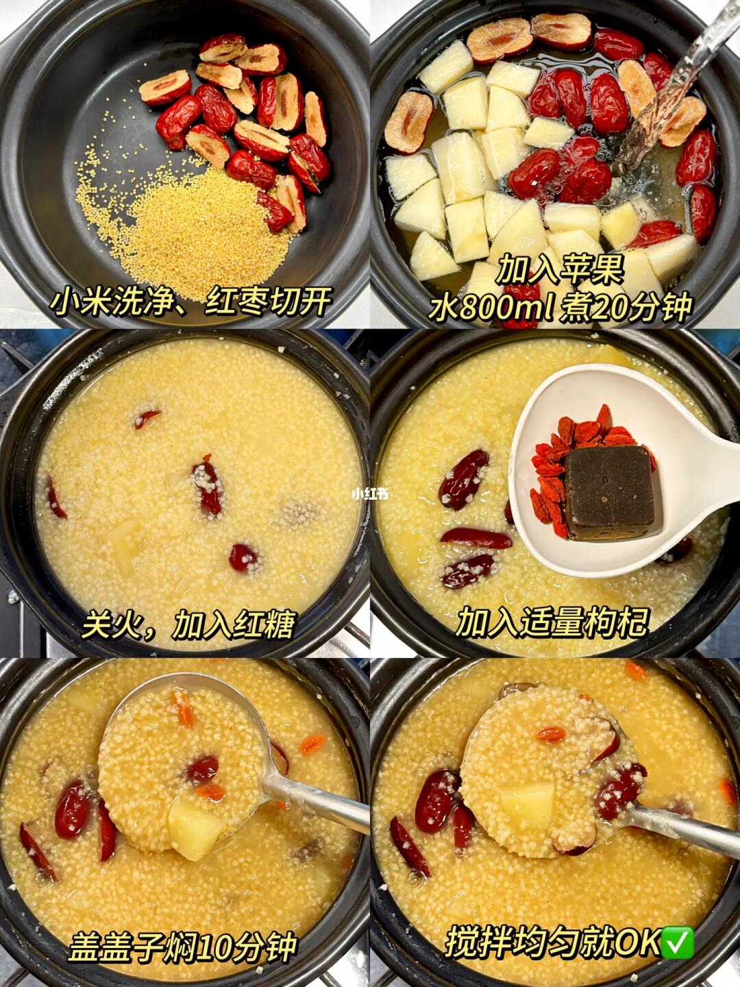✅做法:小米洗净,红枣切开,加入苹果和水800ml,煮20分钟,关火加入红糖和适量枸杞,盖上盖子焖10分钟,搅拌均匀即可!