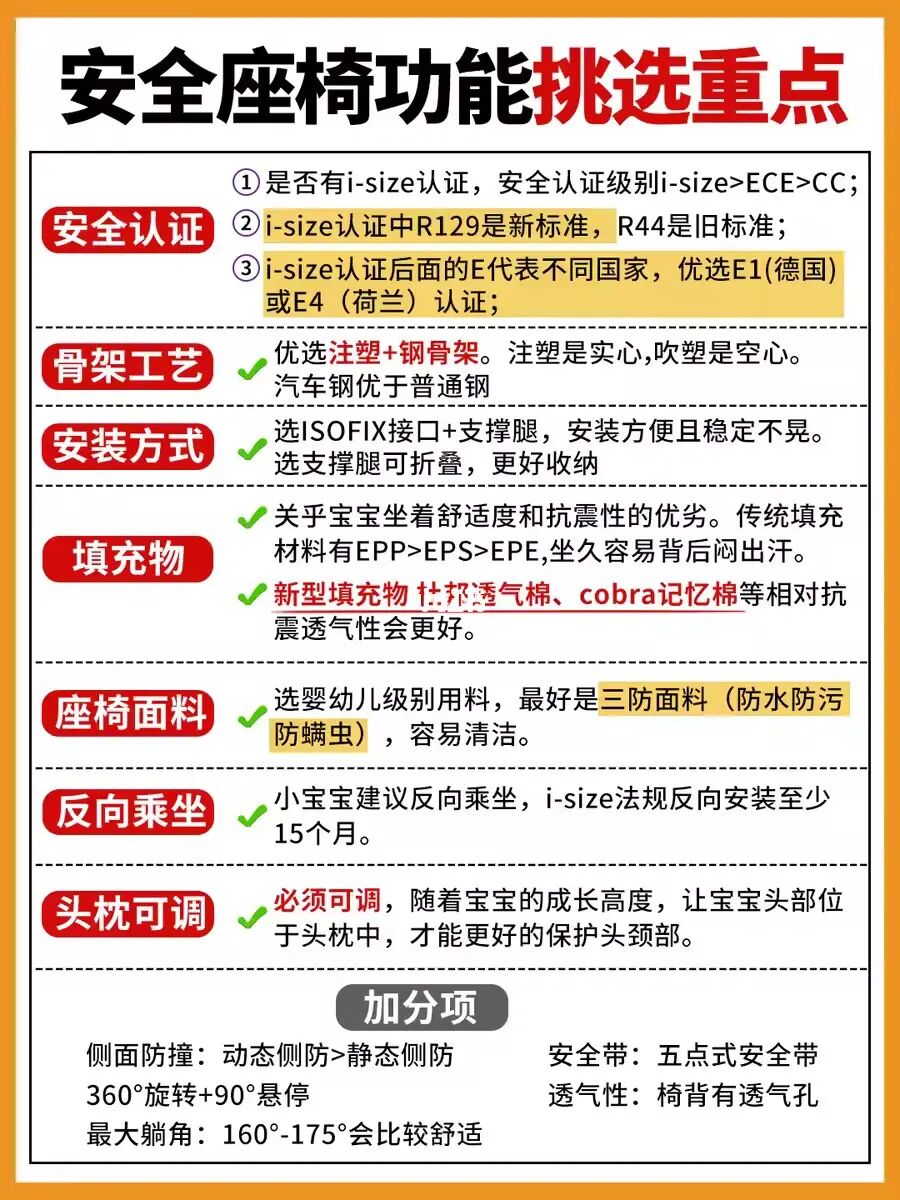 3.乘坐安全性:安全认证、填充骨架、安装方式、、安全带