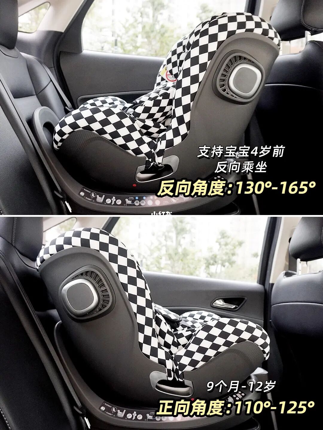 💺结构上是一体注塑,还优选汽车钢做骨架,增加了耐用性。反向安装能到4岁,最大躺角165°,宝宝躺着刚好也不会窝脖子,进一步保护小宝宝颈椎免受车冲击带来的伤害。我家是选跟郭晶晶同款黑白棋盘格!真的好看性价比也高‼️