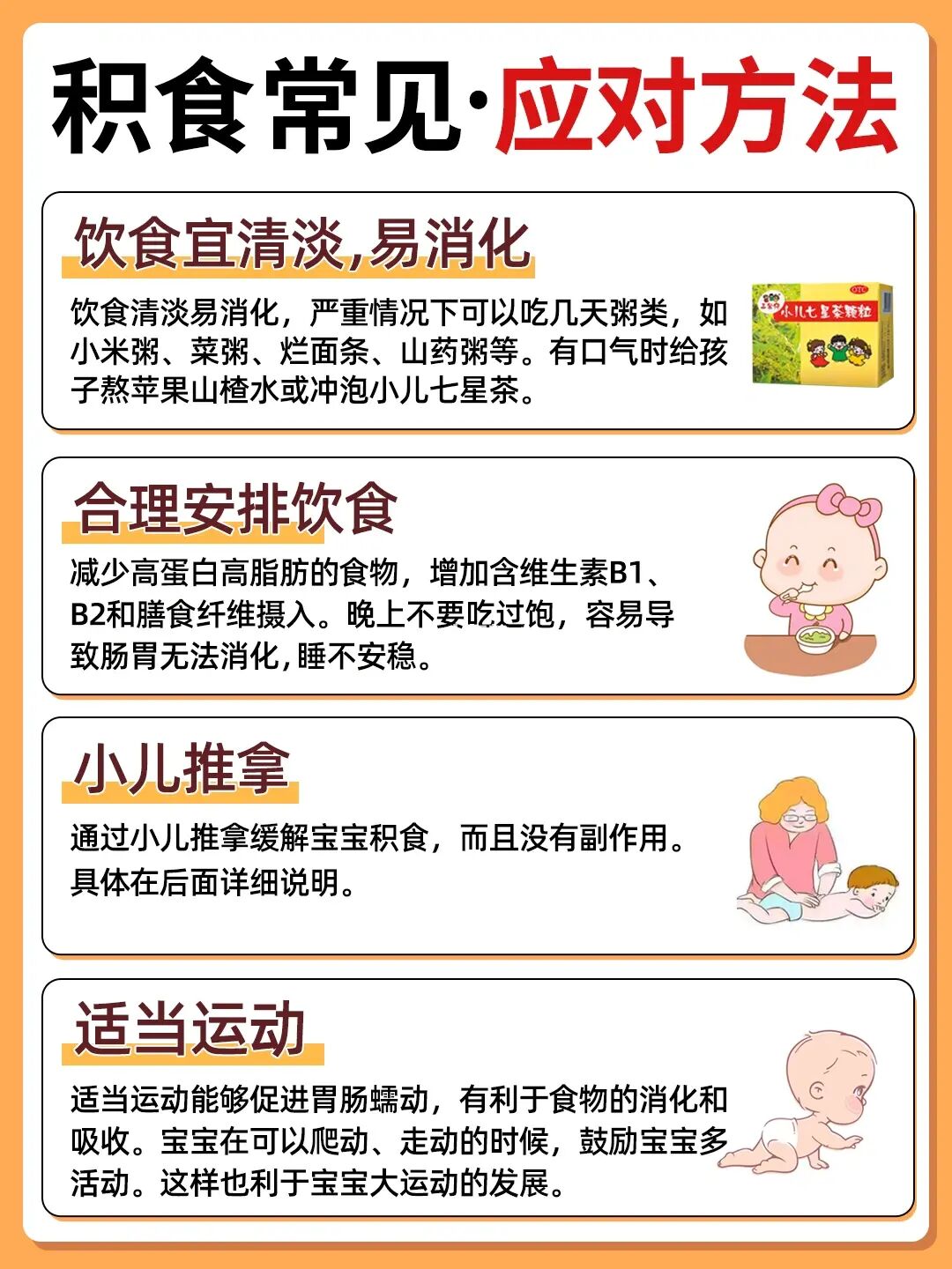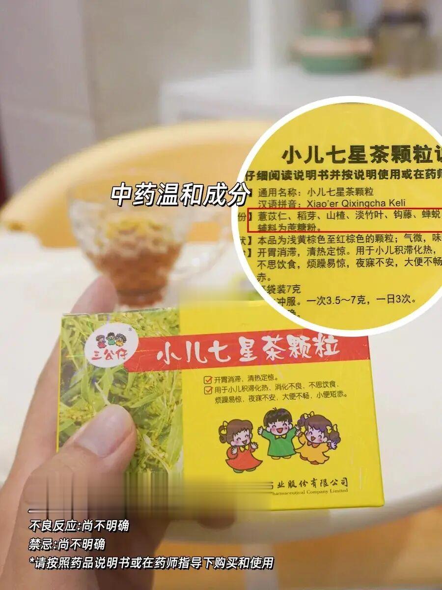 像刚发现宝宝积食,按上面的食疗方法去调理,但要注意这段时间要饮食清淡减少高蛋白高脂肪的食物,尤其是晚餐要以蔬菜少荤为主。如果宝妈没有时间煮小儿四神汤,可以直接入手三公仔小儿七星茶颗粒,冲泡会更方便些。像我家在南方,像是夏天或者季节交际,稍微不注意饮食就会容易消化不好或积食,所以在家中都常备一些三公仔小儿七星茶颗粒,温和中药成分,喝起来是淡淡的甜酸味,宝宝还是挺容易接受的~