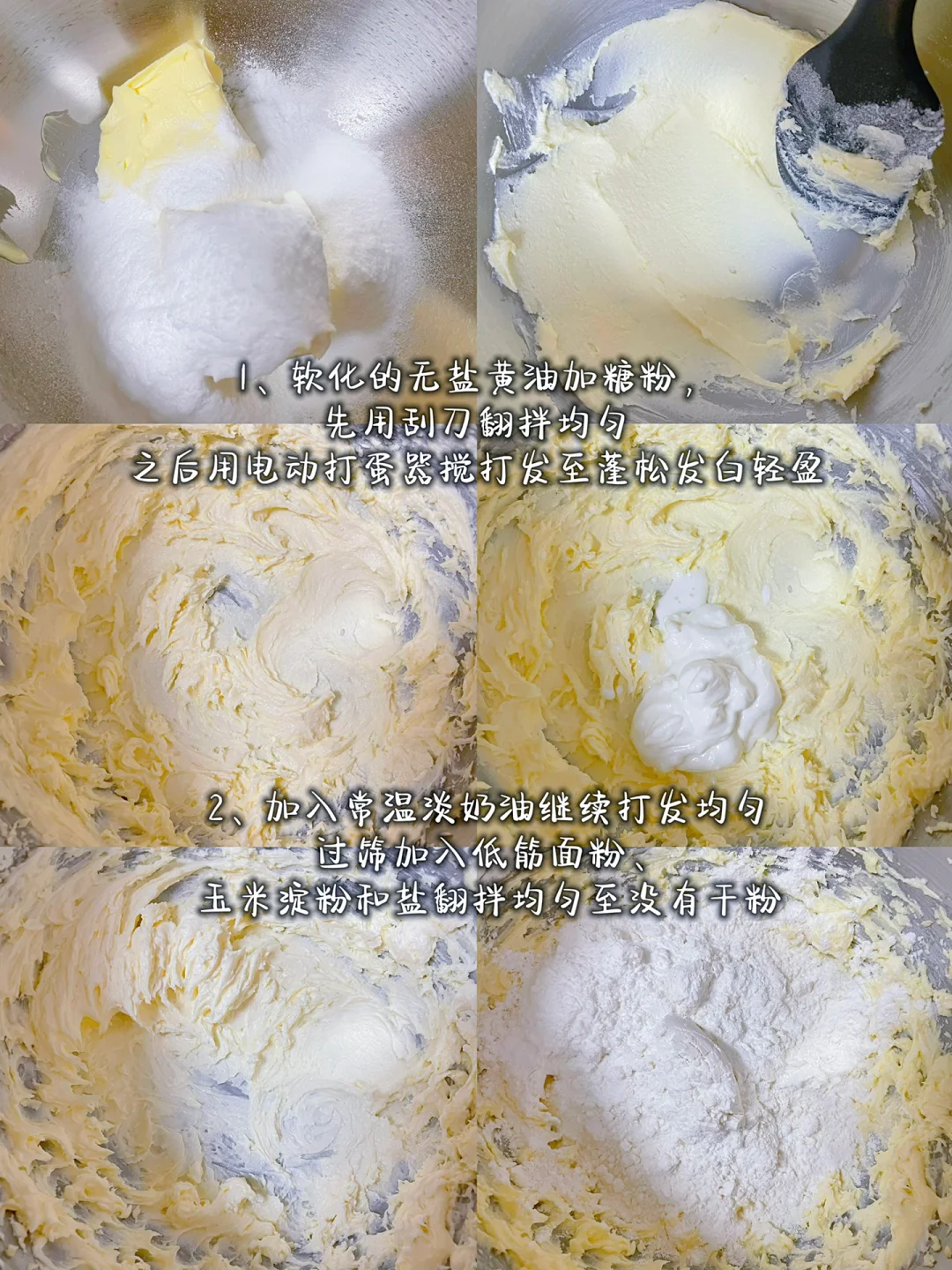 【所需食材】 无盐黄油80克|糖粉30克|淡奶油25克|低筋面粉85克|玉米淀粉15克|盐0.5克 【制作过程】 1⃣️软化的无盐黄油加糖粉,先用刮刀翻拌均匀之后用电动打蛋器搅打发至蓬松发白轻盈 2⃣️加入常温淡奶油继续打发均匀 3⃣️过筛加入低筋面粉、玉米淀粉和盐翻拌均匀至没有干粉,装入裱花袋,裱花袋套八齿裱花嘴,挤在烤盘上 4⃣️烘烤时间温度:160度20分钟左右 🧡黄油必须打发至蓬松发白,这样做出来的饼干口感才能酥松、轻盈 🧡饼干烤完凉透后再拿,刚烤完特别酥拿不起来