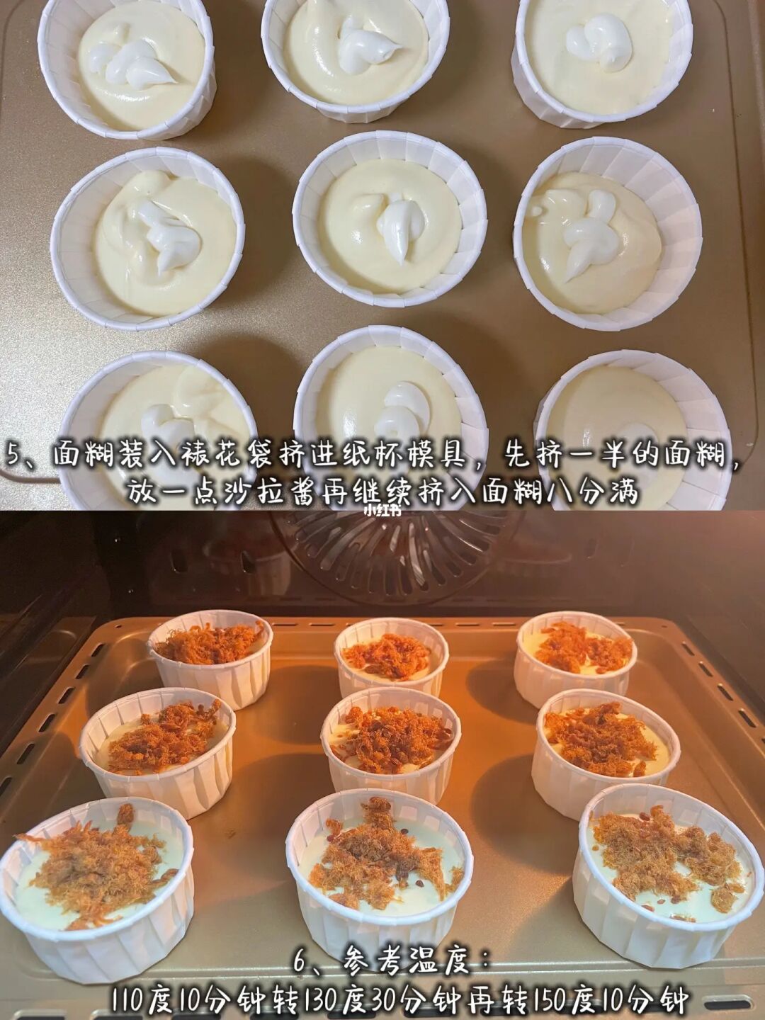 5⃣️蛋清和蛋黄糊分两次翻拌均匀,面糊装入裱花袋挤进纸杯模具,先挤一半的面糊,放一点沙拉酱再继续挤入面糊八分满,震一下模具去除部分气泡,表面放肉松