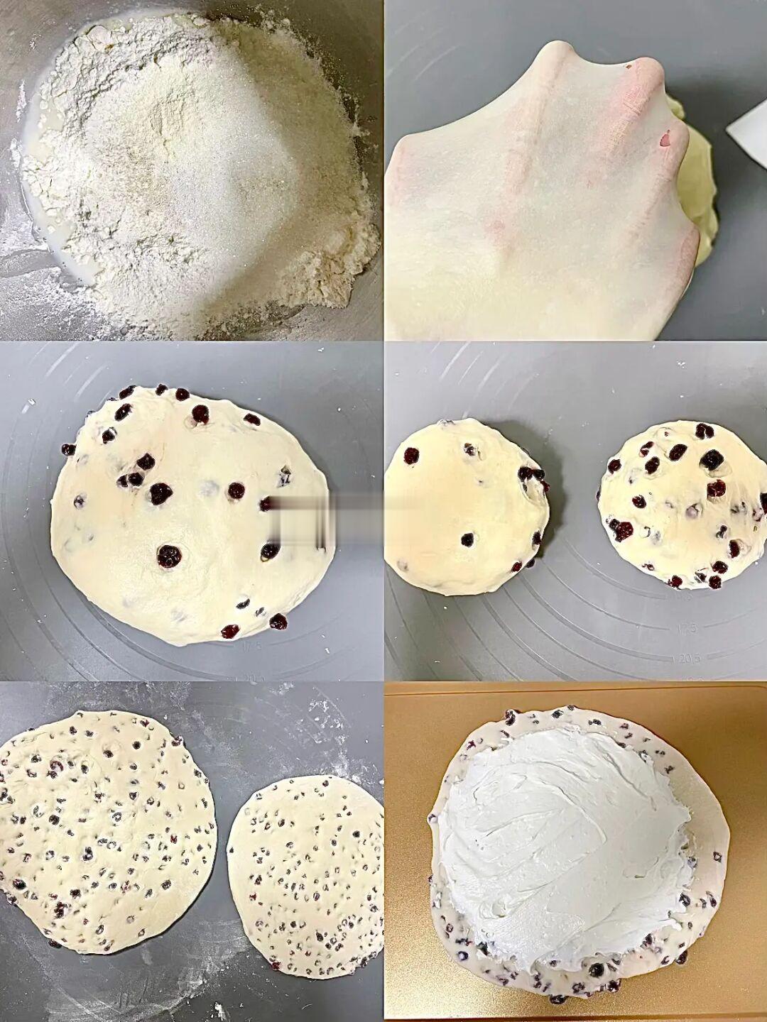 4⃣️面团擀成圆片,其中一个涂抹软化的奶油奶酪,盖上另一个面片,中间用叉子扎孔,烤箱发酵功能发酵至1.5倍大