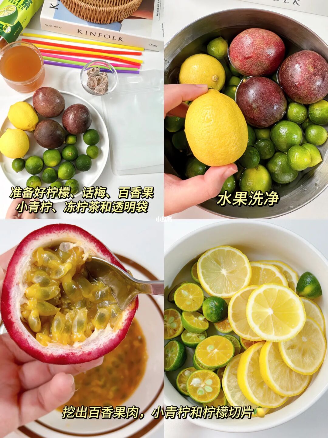 1⃣️柠檬、小青桔、百香果外皮用盐搓洗干净