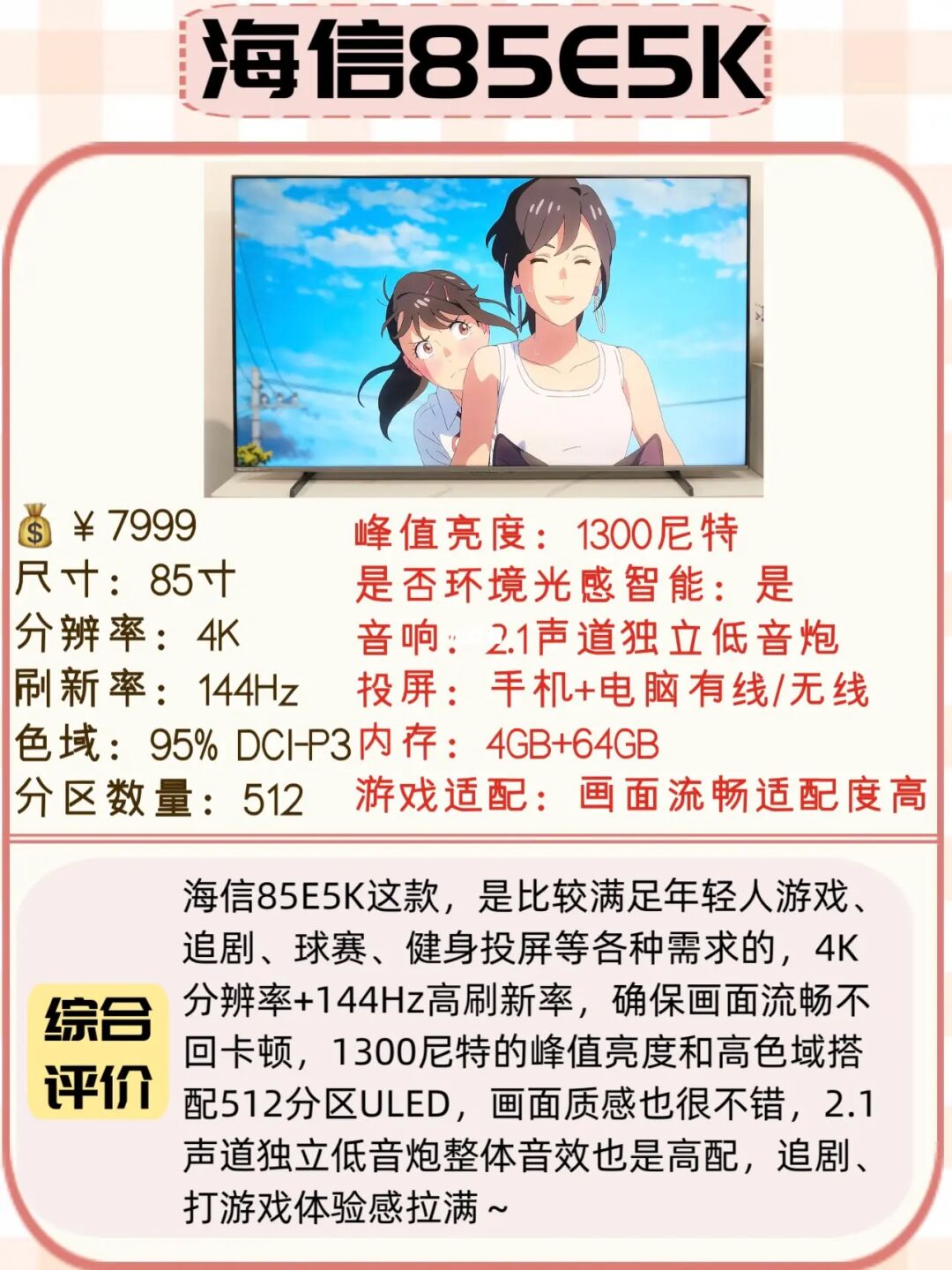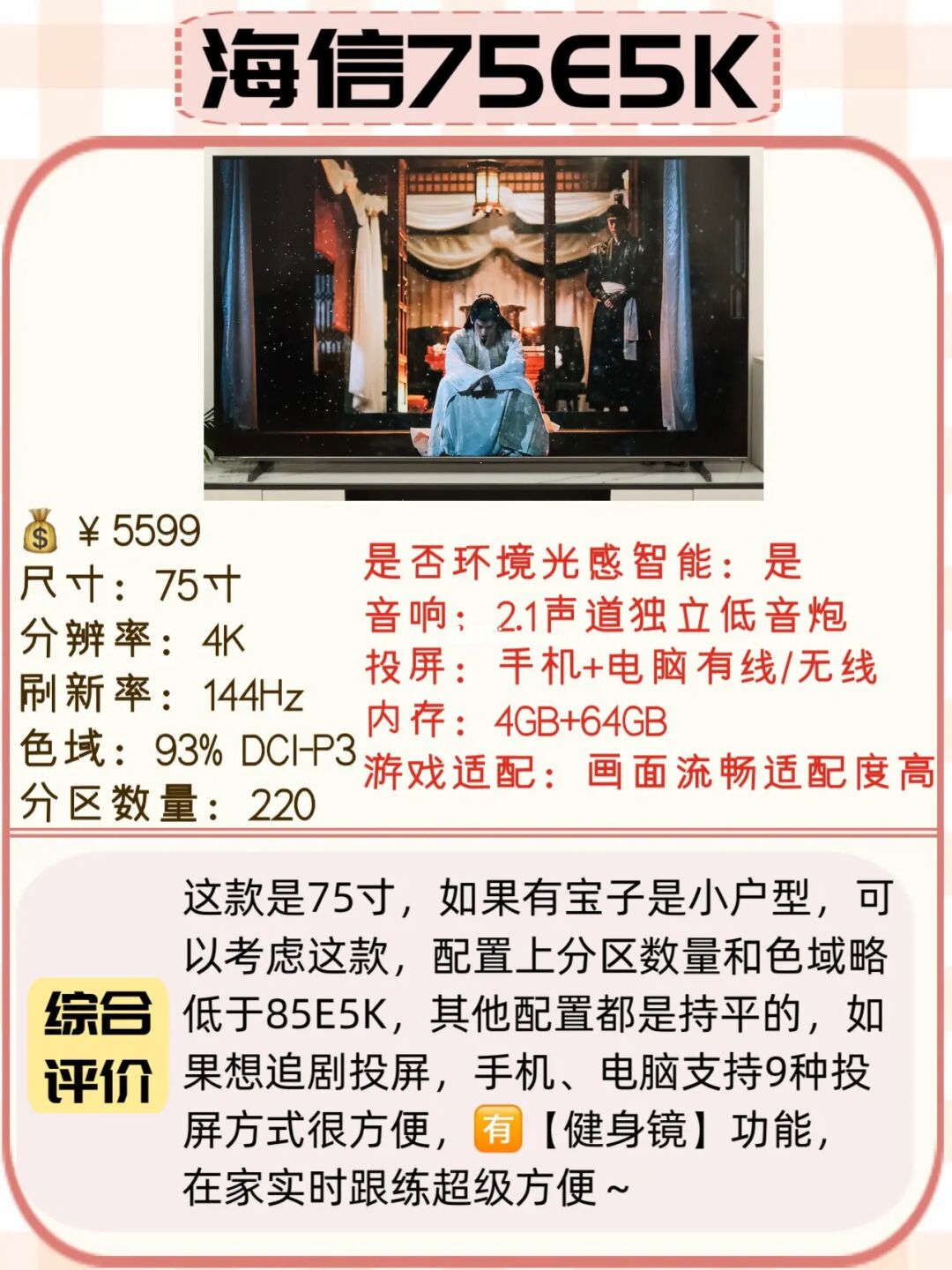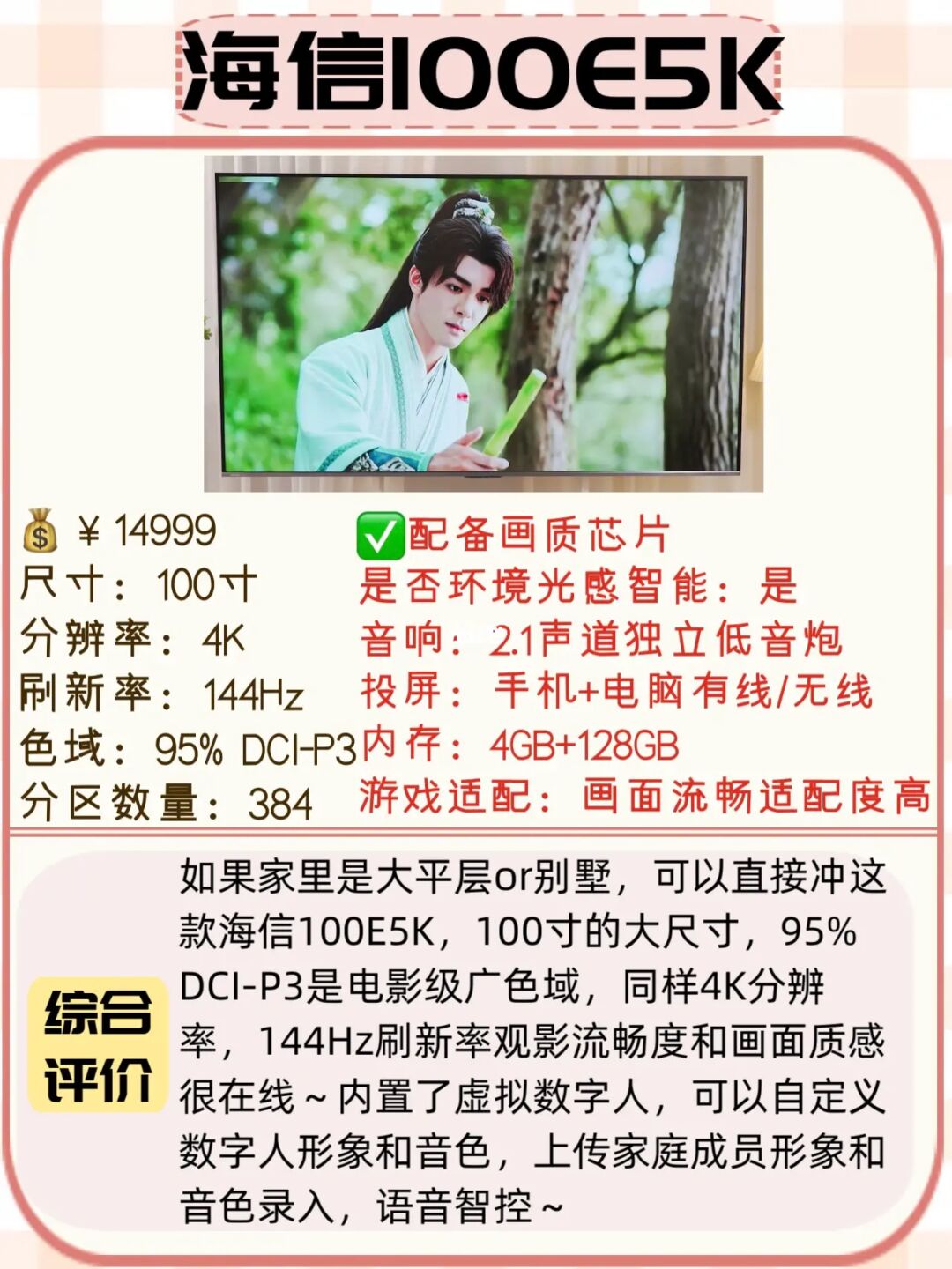想要小尺寸些的可以冲海信75E5K,大平层想要100寸的大电视,可以冲海信100E5K,具体参数分析给你们放图里了,看图⬆️⬆️