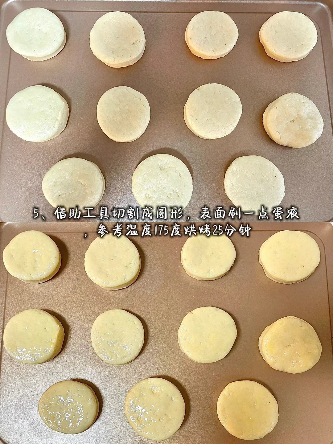 4⃣️面团擀开折叠再折叠,重复操作3次,厚度2cm,借助工具切割成圆形,表面刷一点蛋液