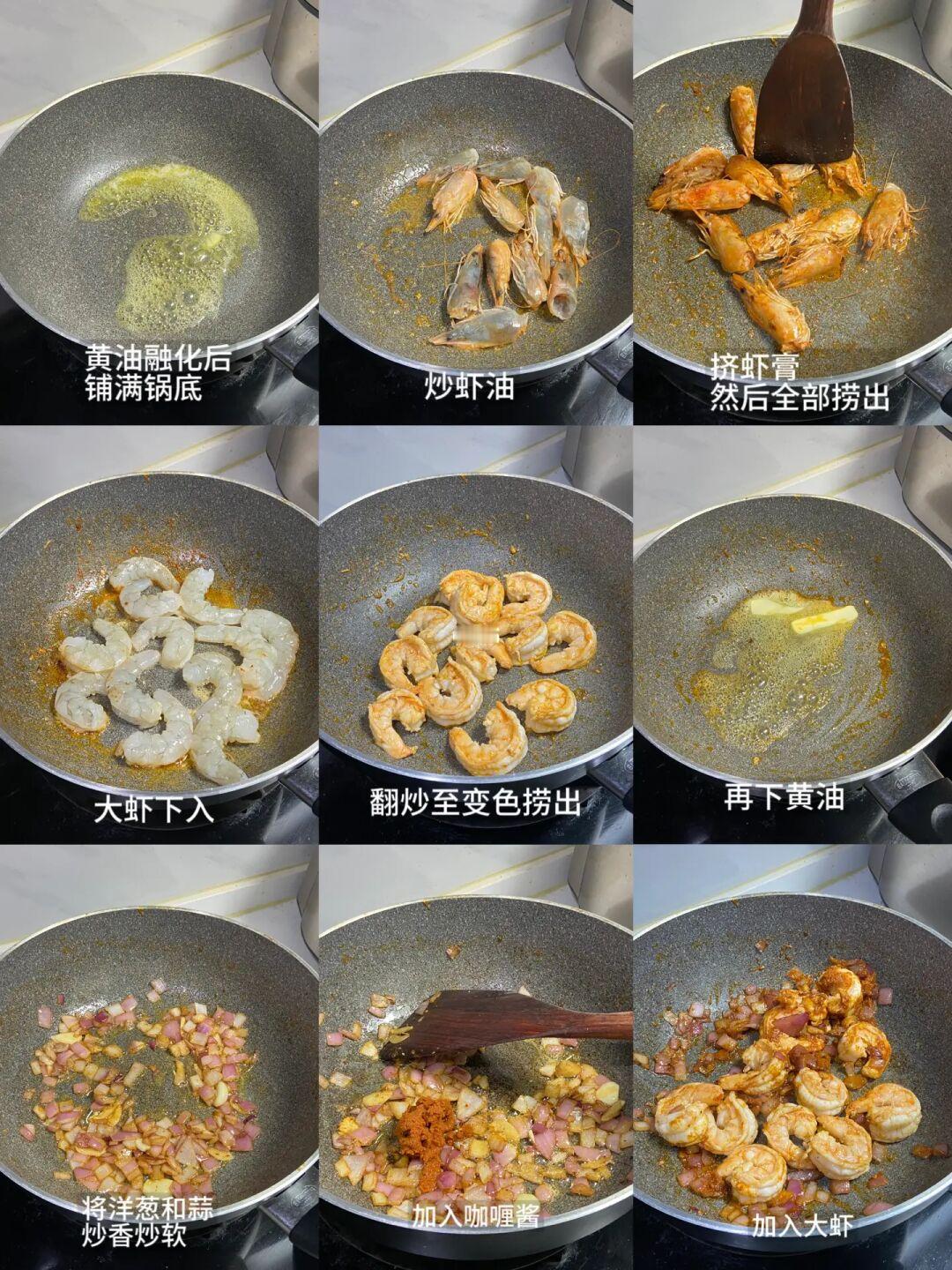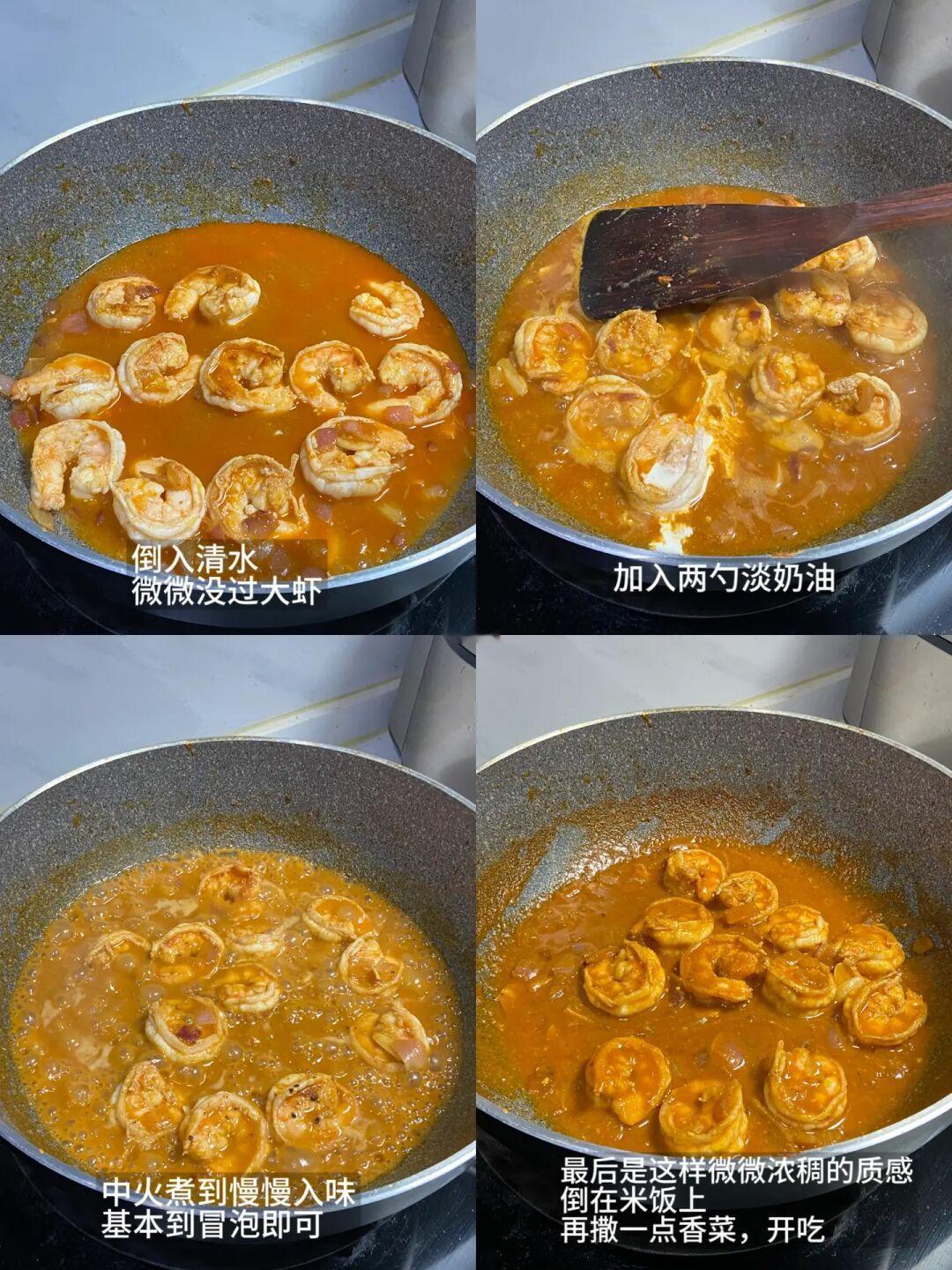 我心心念的咖喱奶油虾!绝对不会出错的简单好吃食谱!图文教程都写得比较详细了,可以参考 ——————【咖喱奶油虾】—————— 食材: 鲜大虾10-12只(1人份量)|黄油|咖喱酱|洋葱|蒜瓣|淡奶油 步骤: 1)大虾洗干净,去虾头去皮,背部划刀去虾线,只保留虾头部分 2)锅中下黄油,融化铺平底即可,放虾头炒出虾油,同时用铲子挤一挤虾膏 3)捞出虾头,再加入点黄油,直接将大虾下入,翻炒到变色捞出 4)将切碎的洋葱末和大蒜末下入,翻炒到出香味 5)加入咖喱酱、大虾、倒入一杯清水,微微没过大虾即可 6)搅拌咖喱酱到融化,加入两勺淡奶油,一点黑胡椒、盐,然后慢慢煮开,煮到稍微浓稠冒泡即可 tips: 1⃣️我用的是红咖喱酱,本身有辣度,如果买的是原味咖喱,可以自行加点辣椒粉,完全不吃辣的可以不加辣椒粉 2⃣️我直接倒在饭上吃了,拌着好好吃!