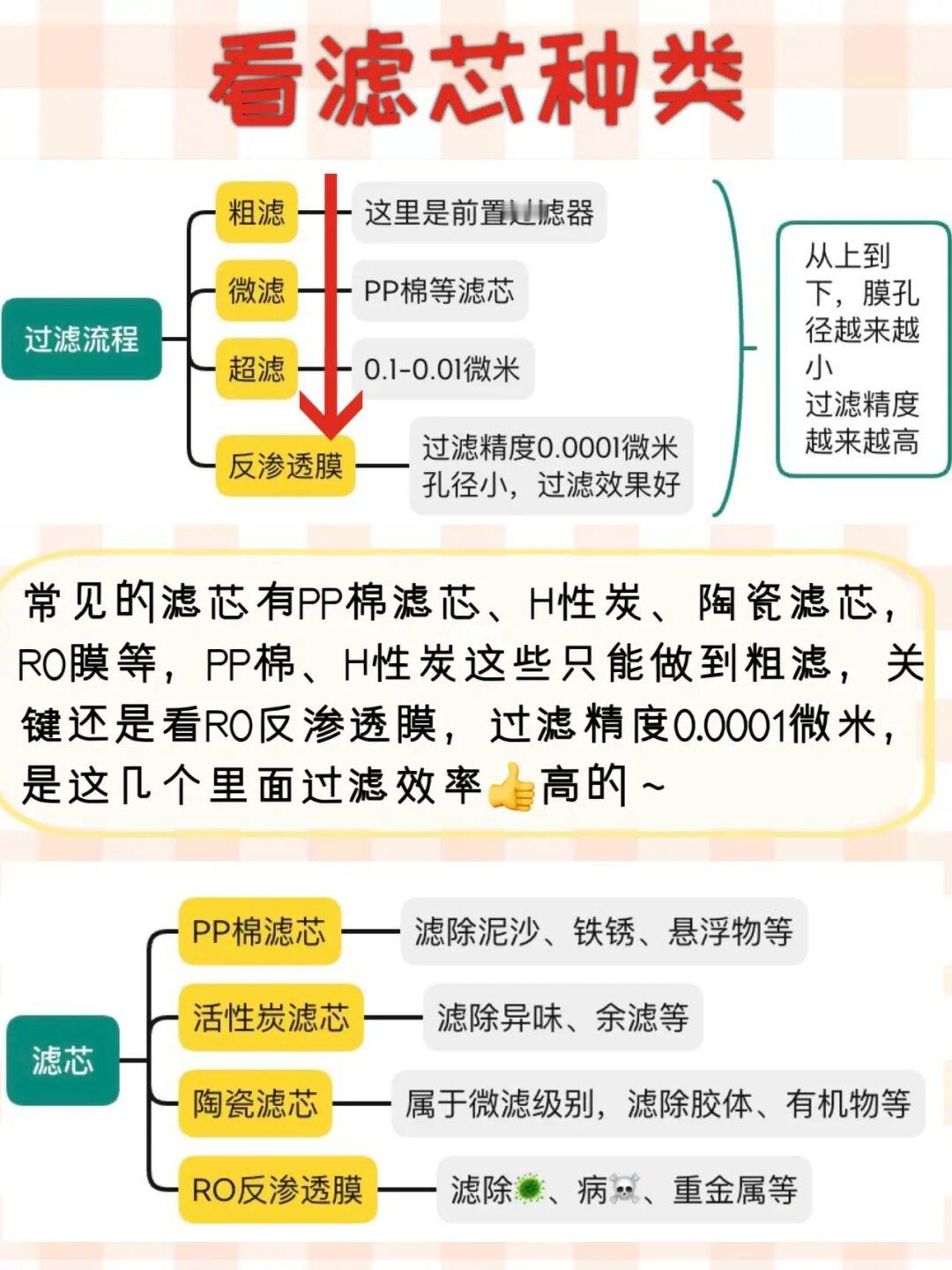 常见的滤芯有PP棉滤芯、H性炭、陶瓷滤芯,RO膜等,PP棉、H性炭这些只能做到粗滤,关键还是看RO反渗透膜,是这几个里面过滤效率👍高的。能过滤病毒细🦠、重金属等有害杂质,达到直饮标准~具体看图3⬆️⬆️