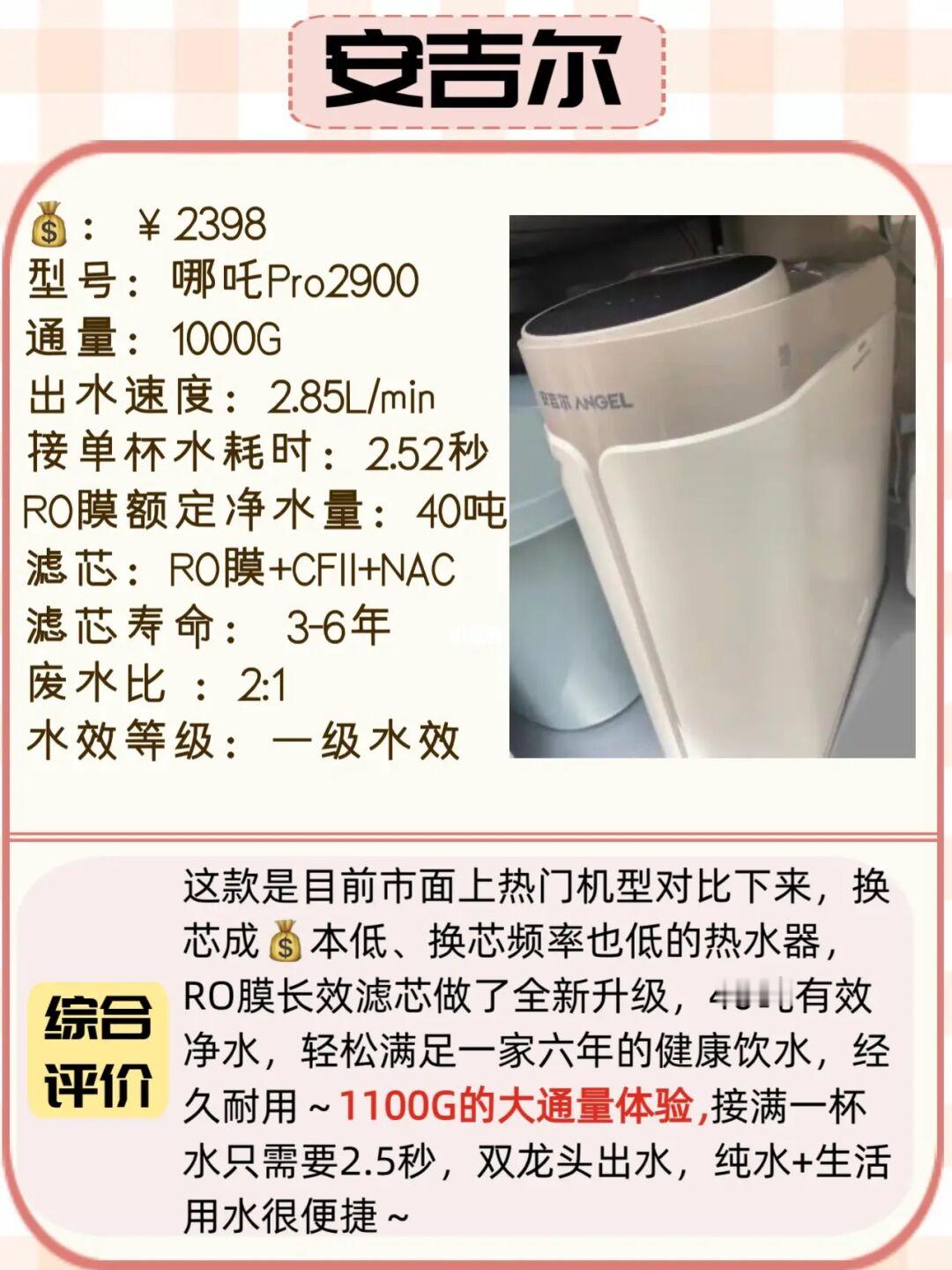 安吉尔这款出水流速是2.85L/min,可以达到1100G大通量体验,出水速度快,出水量大,家庭用水最好选用这种大通量的,小通量接水太费时间,也耽误做饭。具体看图⬆️⬆️