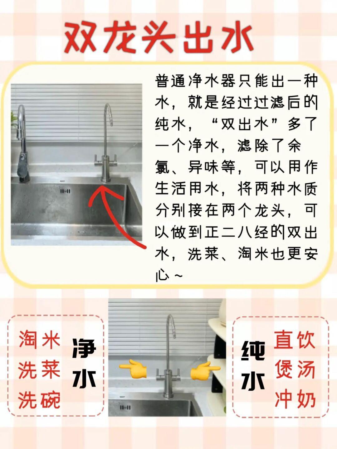 普通净水器只能出一种水,就是经过过滤后的纯水,“双出水”多了一个净水,滤除了余氯、异味、抗生素等,可以用作生活用水,将两种水质分别接在两个龙头,可以做到正儿八经的双出水,洗菜、淘米也更安心~