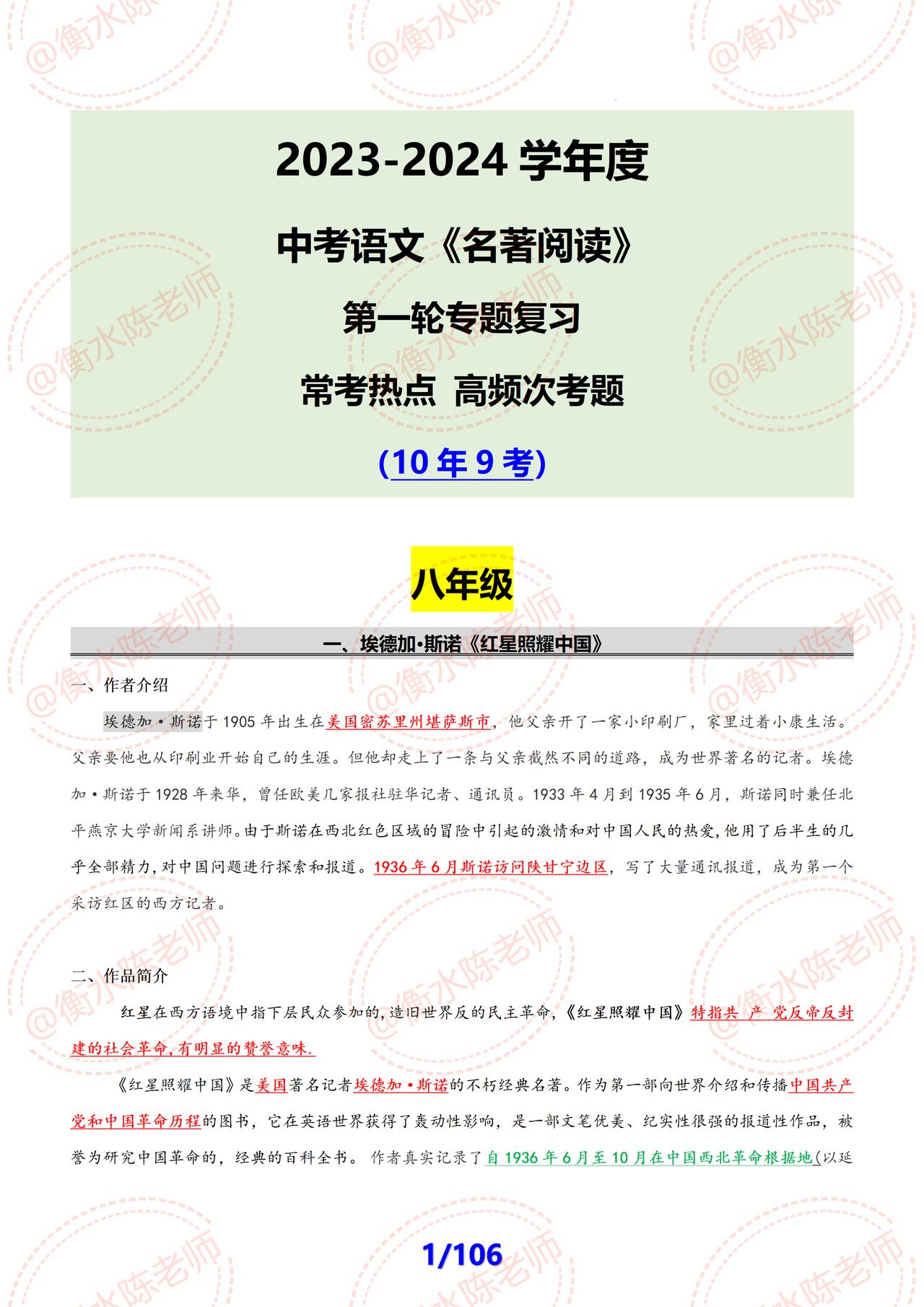 2024年中考语文名著阅读,有关八年级常考的重要知识点,必考热点考题,分享给同学们,这份中考专题复习资料,是近10年回回必考的复习资料,无论八年级还是初三的,好好看一遍哦,考试中出现的考题内容,全部都在这里哦,由于资料比较多,想要获取全部的考生,记得和我沟通联系哦。