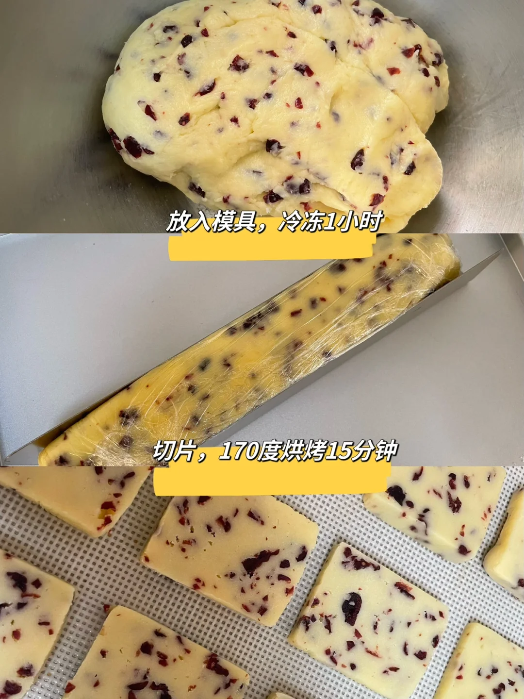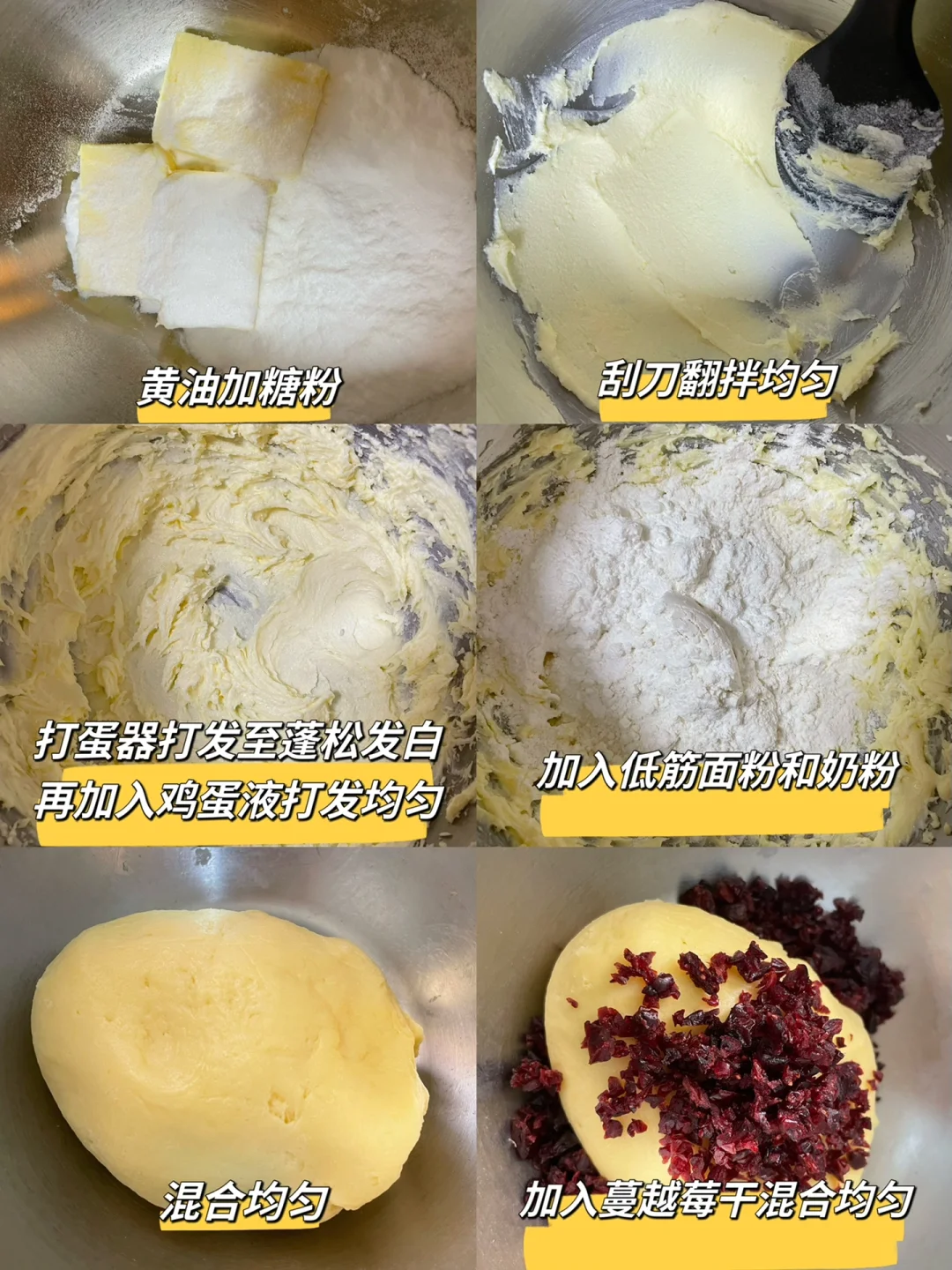 配方参考感谢! 【所需食材】 无盐黄油80克|糖粉50克|鸡蛋液50克|低筋面粉150克|奶粉10克|蔓越莓干40克 【制作过程】 1⃣️软化的无盐黄油加糖粉,先用刮刀翻拌均匀之后用电动打蛋器搅打发至蓬松发白轻盈 2⃣️加入常温鸡蛋液继续打发均匀 3⃣️过筛加入低筋面粉和奶粉混合均匀至没有干粉,加入蔓越莓干混合均匀 4⃣️包保鲜膜放入U型曲奇饼干模具,冰箱冷冻1小时 5⃣️取出切片,烘烤时间温度:170度15分钟左右