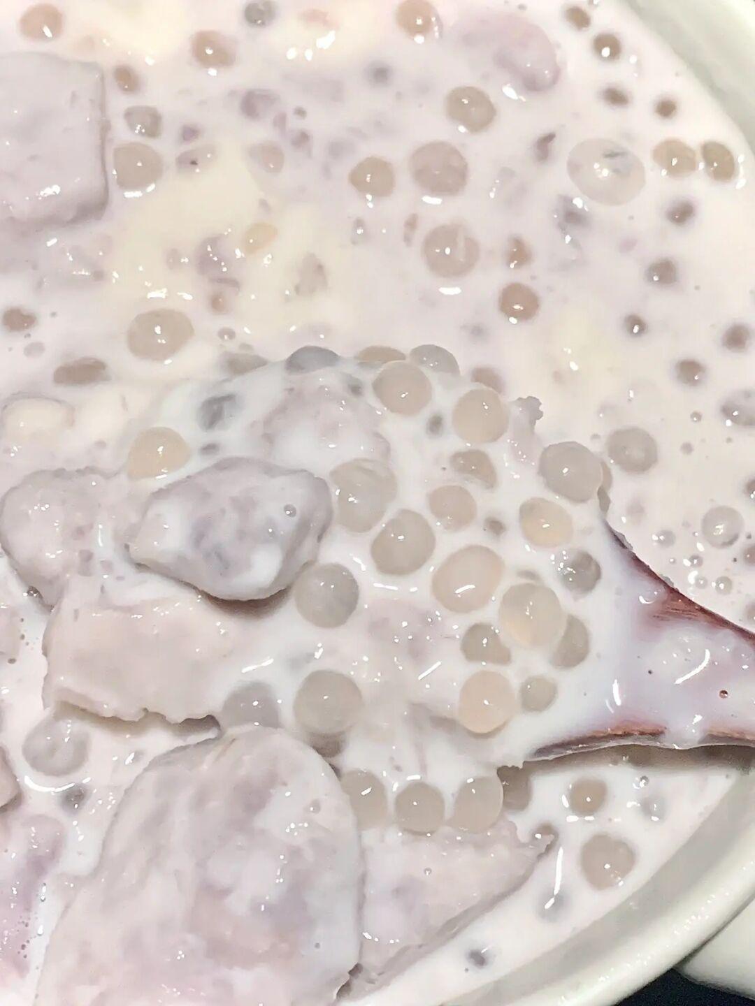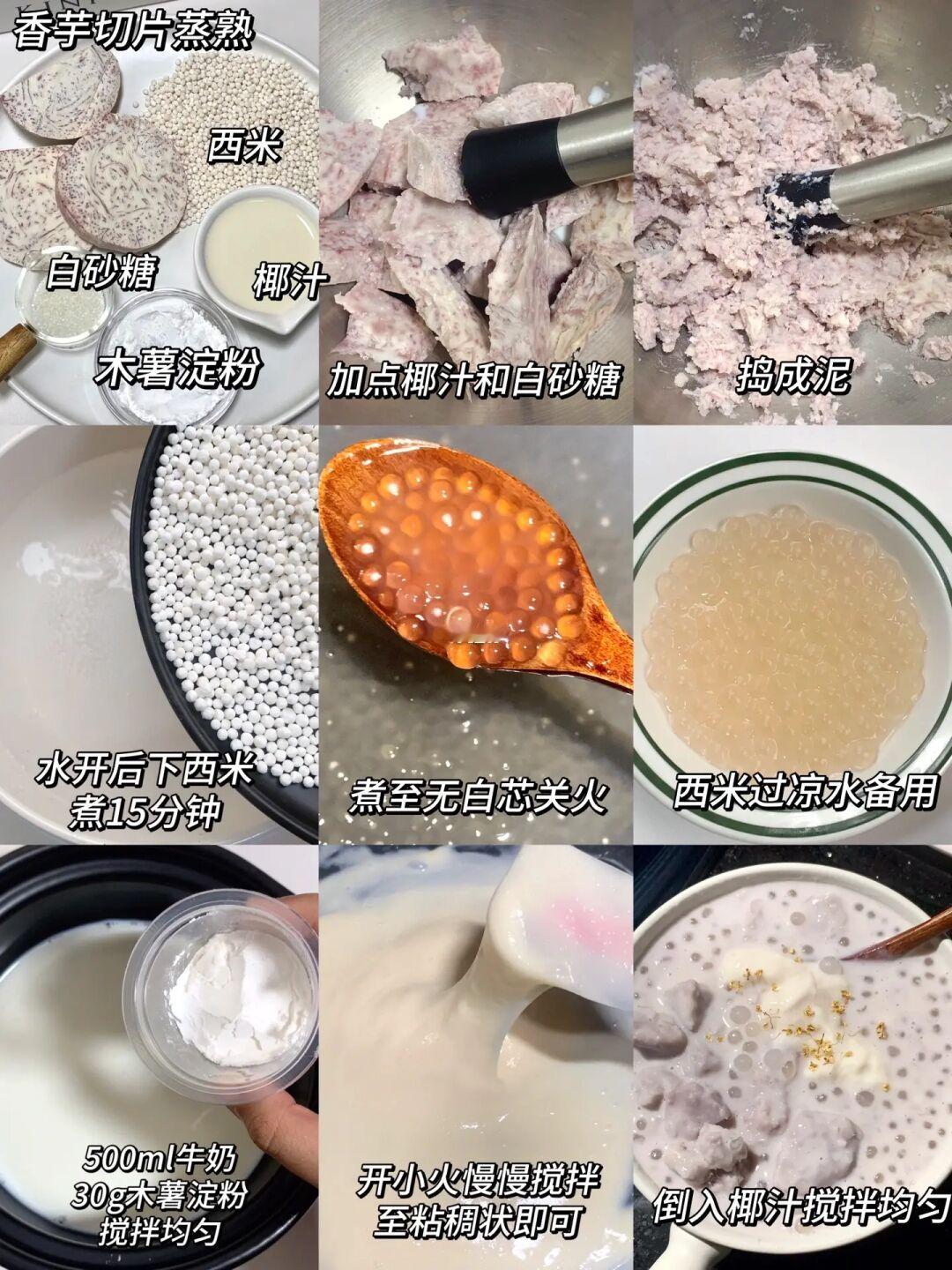 香芋椰汁麻薯西米露! ! !怎么会这么好吃! 😭 芋泥和麻薯西米搭配的口感! 吃过就忘不了! 香甜软糯! 这种糖水真的好好吃!! . 🌈食材: 芋头, 西米, 木薯淀粉,椰汁,糖。 做法: 1⃣️芋头蒸熟放入适量糖, 和一点椰汁。充分搅拌均匀。 2⃣️水开放入西米煮15分钟闷15分钟。 3⃣️锅中倒入椰汁、木薯淀粉和糖。小火开始慢慢搅拌成糊状。碗中倒入椰汁、芋泥、麻薯、西米完成
