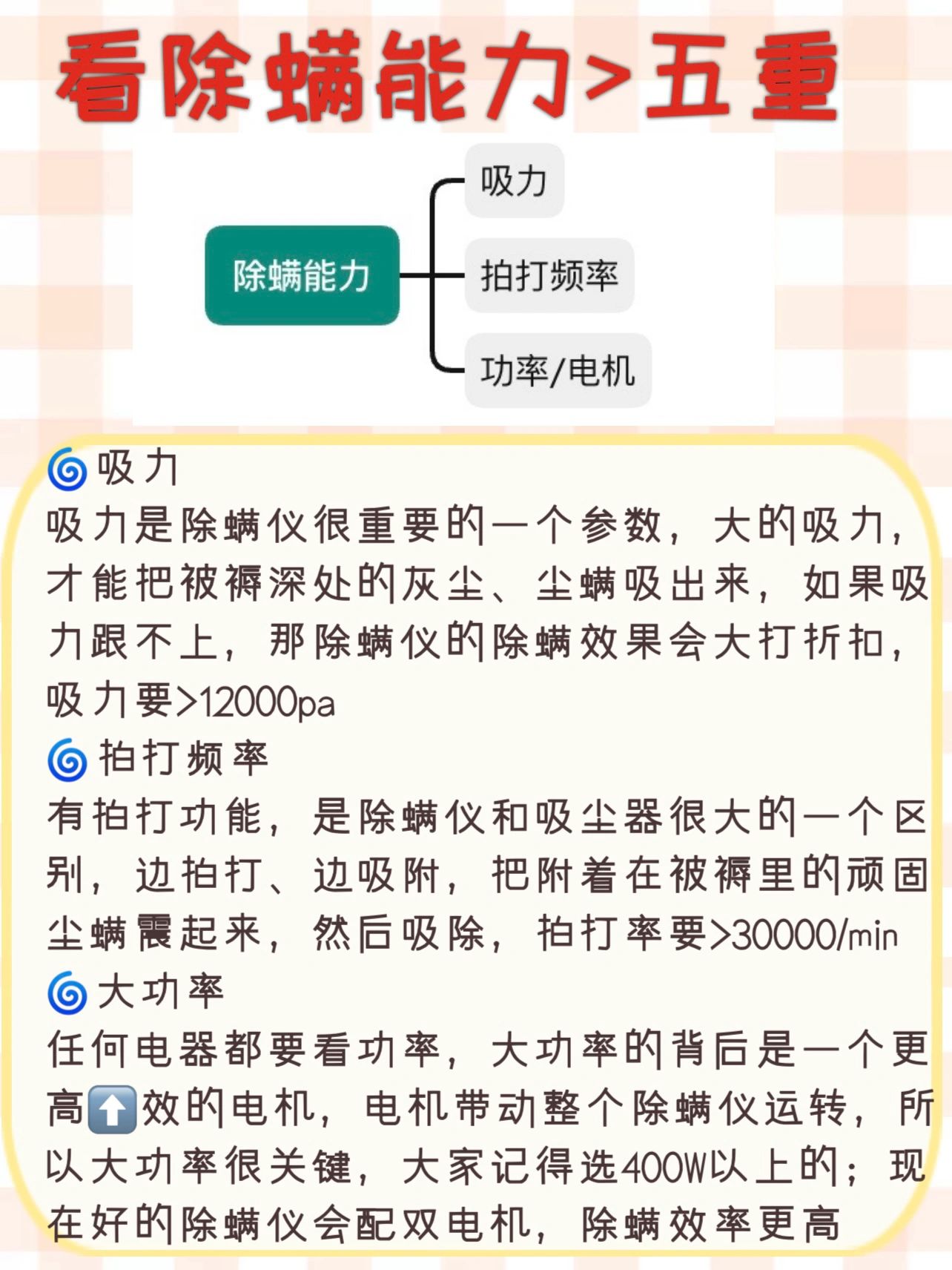 任何电器都要看功率,大功率的背后是一个更高⬆️效的电机,电机带动整个除螨仪运转,所以大功率很关键,大家记得选400W以上的;现在好的除螨仪会配双电机,除螨效率更高