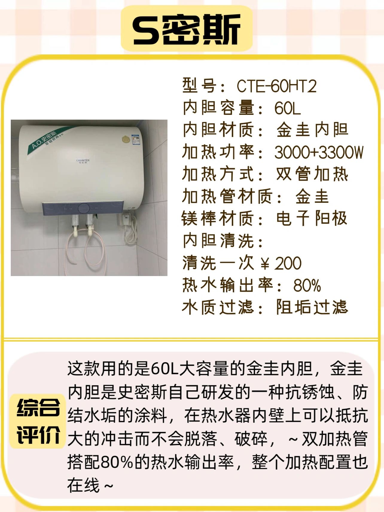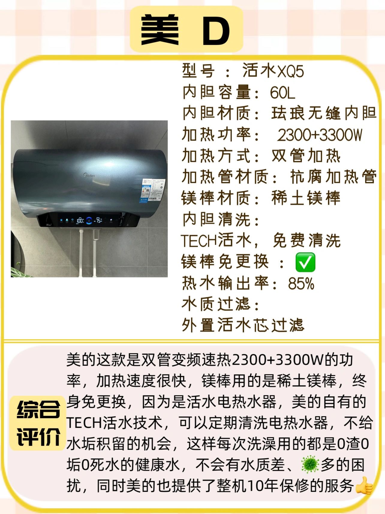 美的这款是双管变频速热2300+3300W的功率,加热速度很快,镁棒用的是稀土镁棒,终身免更换,因为是活水电热水器,美的自有的TECH活水技术,可以定期清洗电热水器,不给水垢积留的机会,这样每次洗澡用的都是0渣0垢0死水的健康水,不会有水质差、🦠多的困扰,同时美的也提供了整机10年保修的服务👍整体性价比高