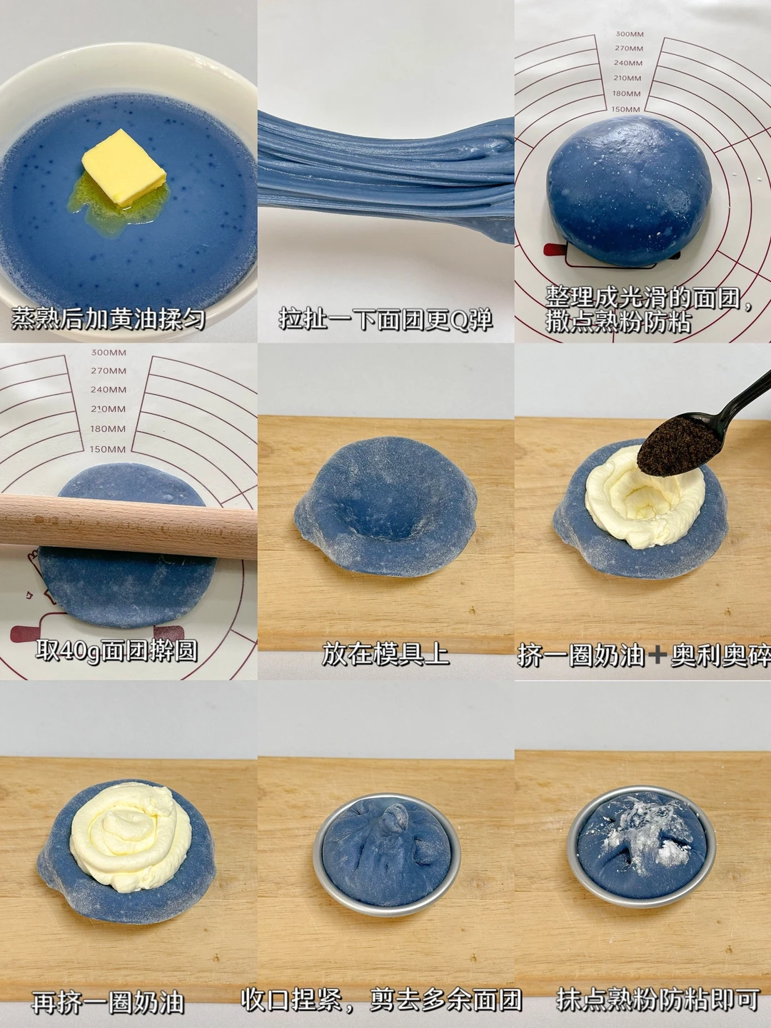 3⃣️面团蒸熟后加黄油揉匀,拉扯一下面团更Q弹,整理成光滑的面团,撒点熟粉防粘,取40g面团擀圆后放在模具上,挤一圈奶油+奥利奥碎+挤一圈奶油收口捏紧,剪去多余面团,抹点熟粉防粘即可。