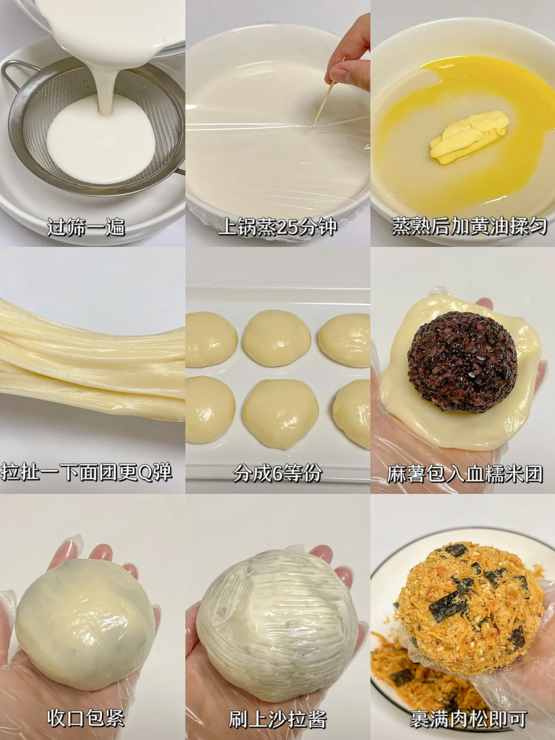 3⃣️面团蒸熟后加入黄油揉匀,拉扯一下面条更Q弹,分成6等份,包入血糯米团,收口包紧,刷上沙拉酱,裹满肉松即可开吃。